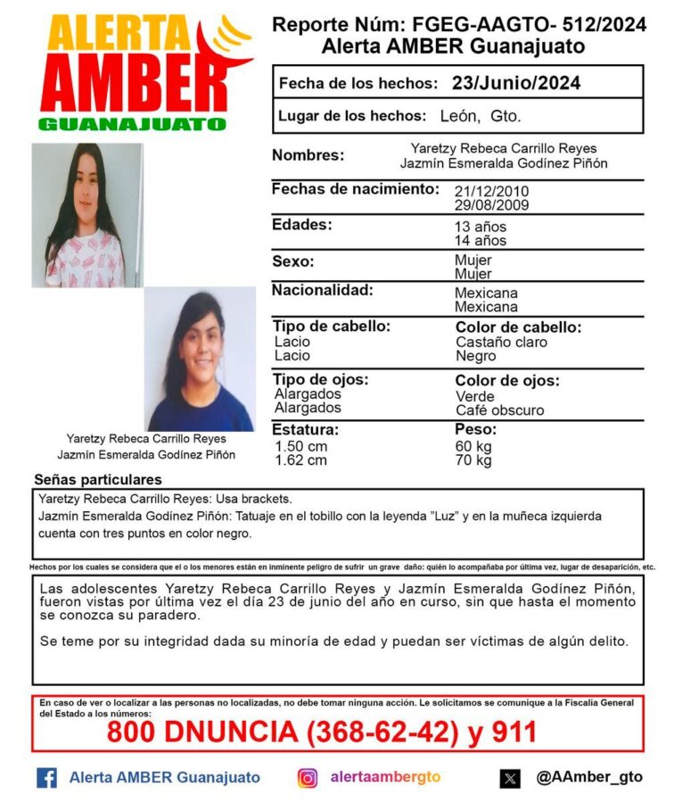 De acuerdo con la información de su Alerta Amber, las menores son Yaretzy Rebeca Carrillo Reyes de 13 años, y Jazmín Esmeralda Godínez Piñón de 14 años.