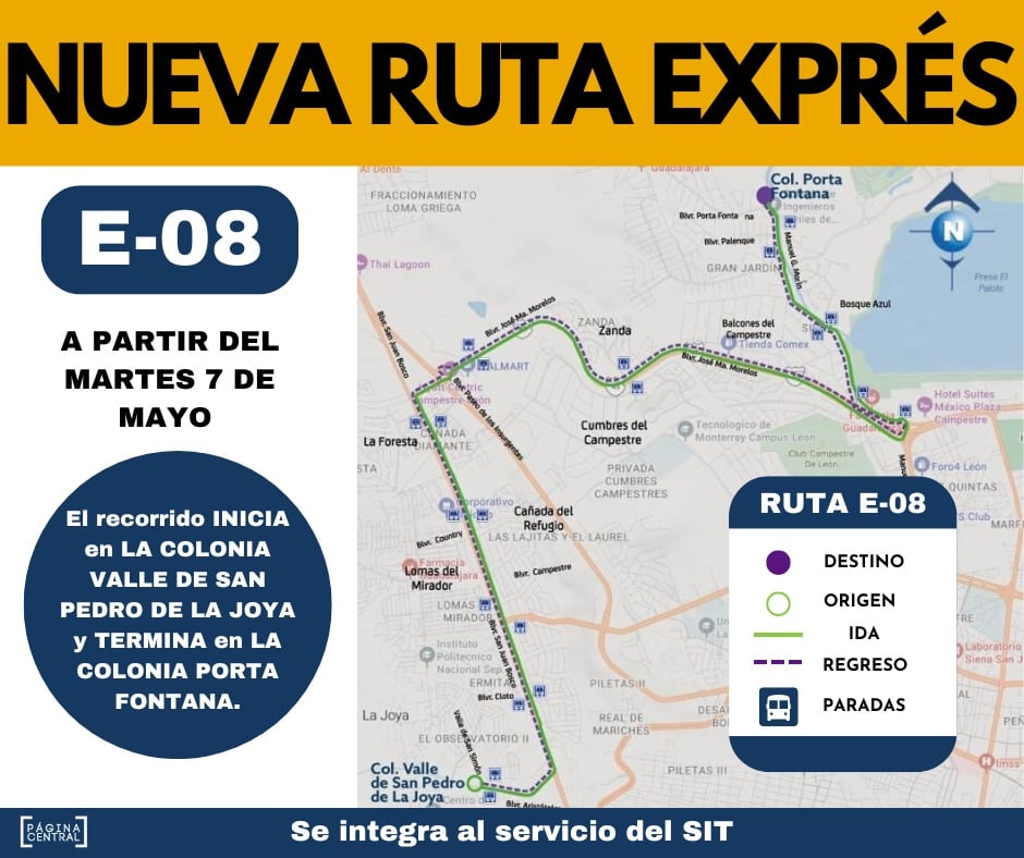 La E-8 realizará paradas puntuales en el bulevar Aristóteles, prolongación San Juan Bosco, Libramiento Morelos y Gómez Morín (antiguo camino a Comanja de Corona), con recorrido de 25.3 kilómetros en un tiempo de 70 minutos por ciclo completo (35 minutos de ida y 35 minutos de regreso).