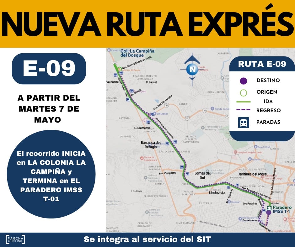 La ruta exprés E-09 inicia el recorrido desde la colonia La Campiña del Bosque con destino al paradero del IMSS T-01.