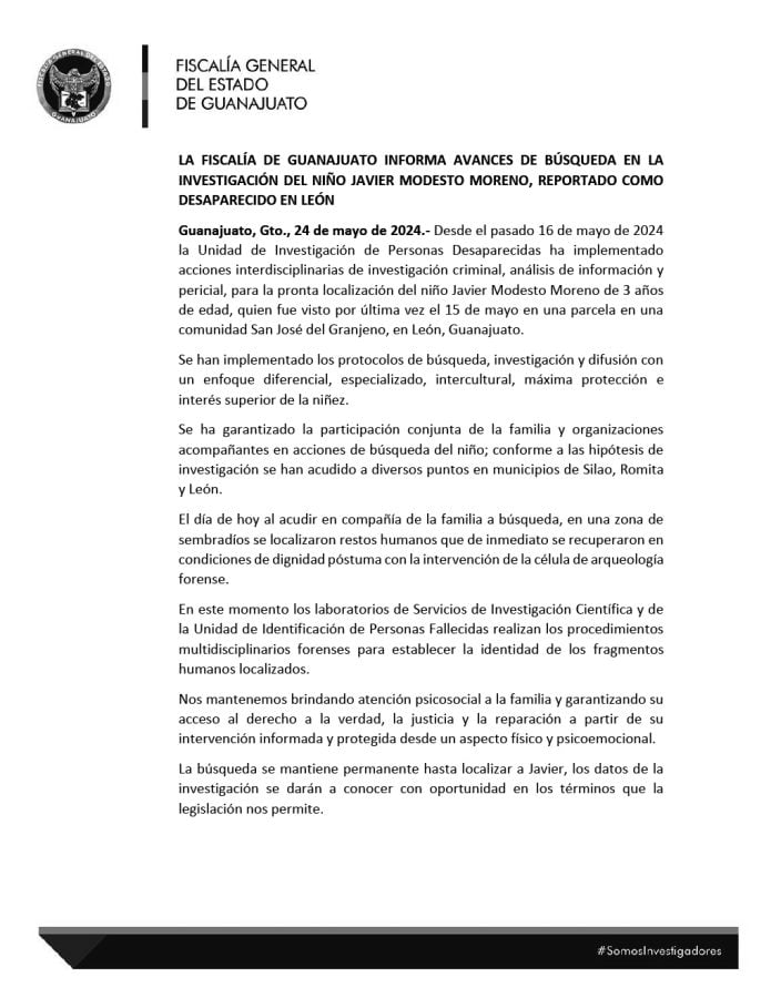 León, Guanajuato.- Este viernes, en las jornadas de búsqueda organizadas por la sociedad civil y autoridades de la Fiscalía General del Estado para localizar a Javier, de 3 años, desaparecido desde hace 9 días en la ciudad, se localizaron restos humanos.