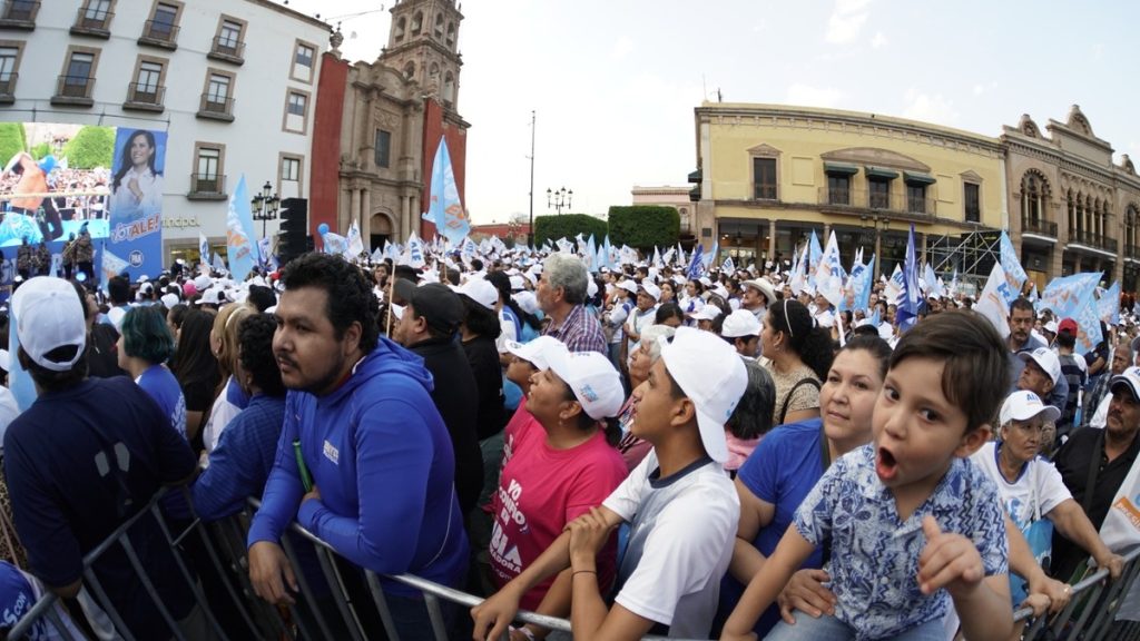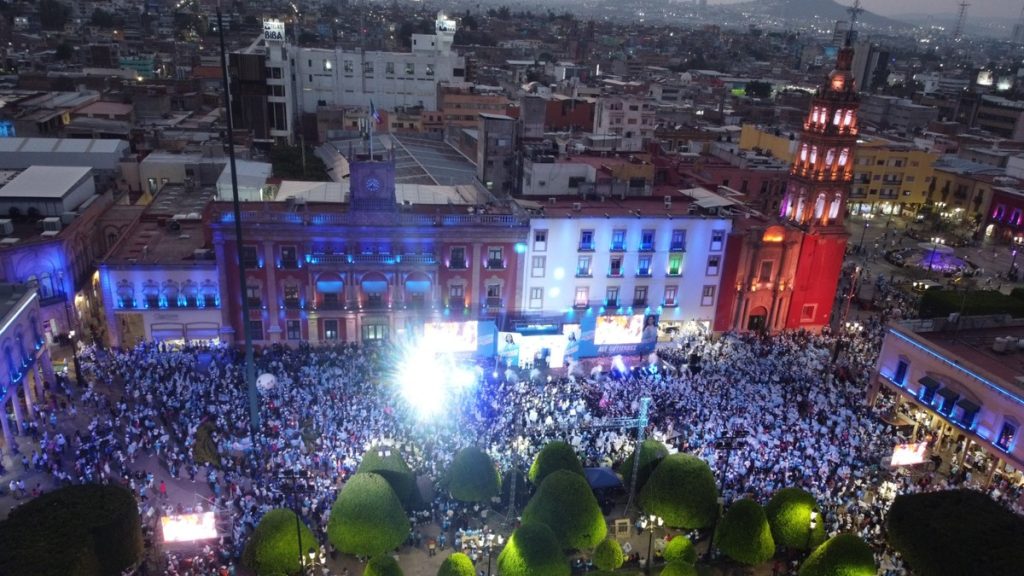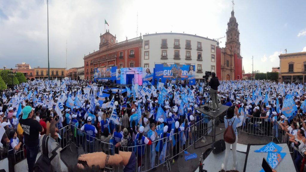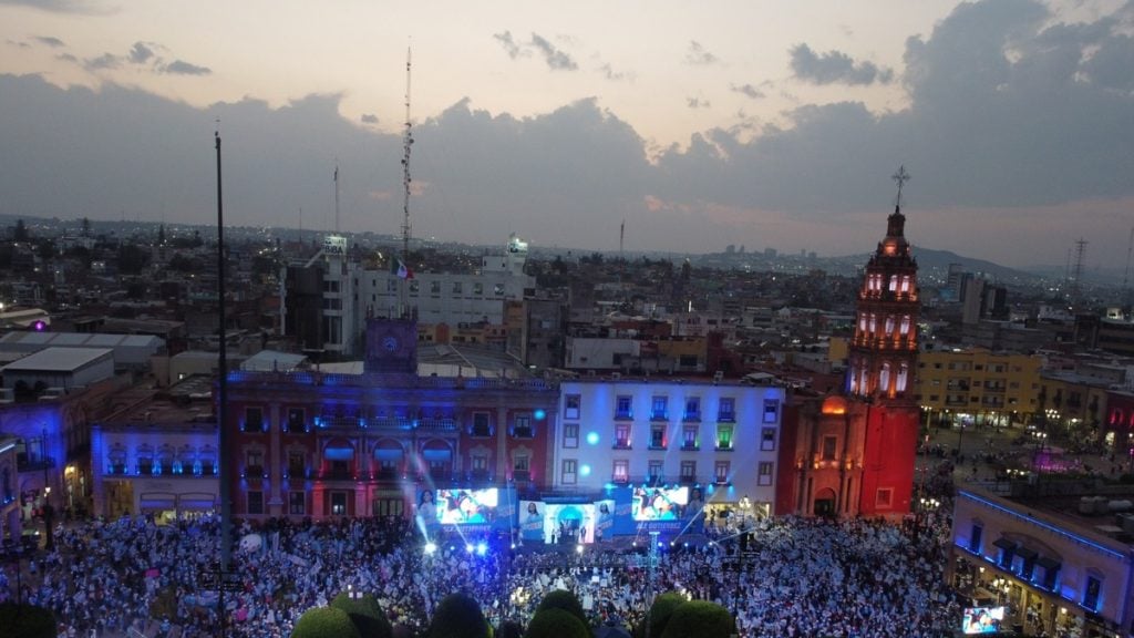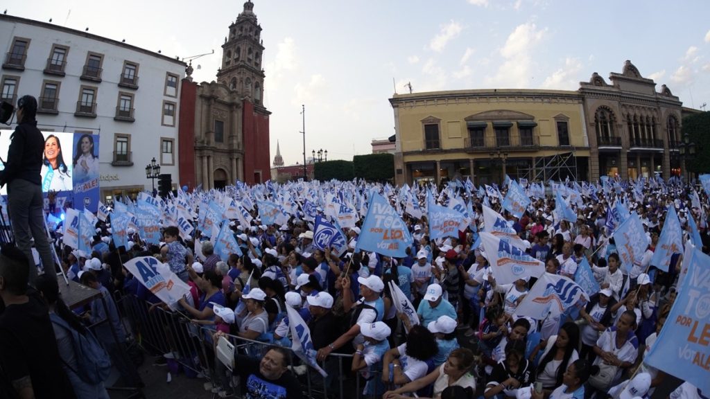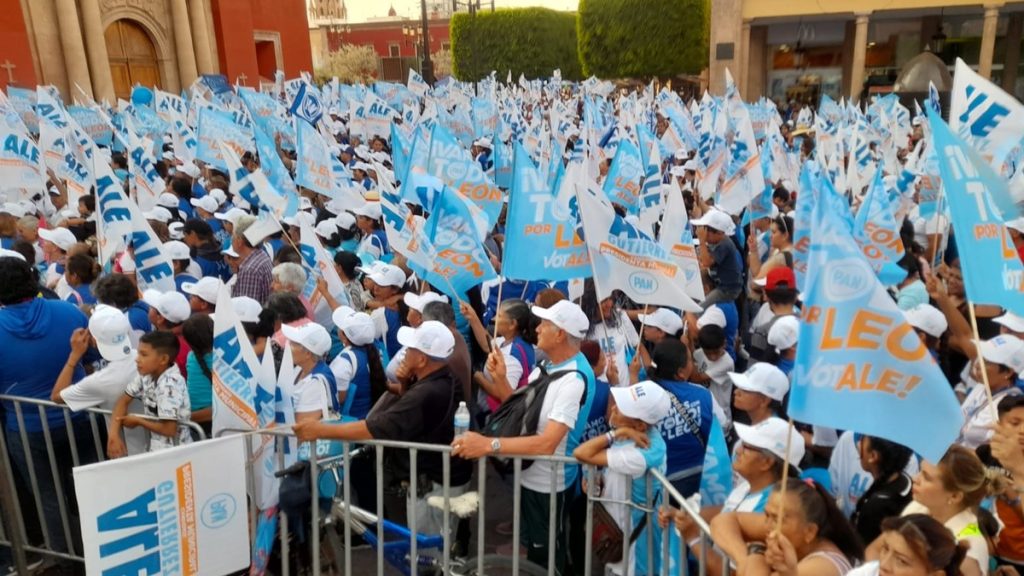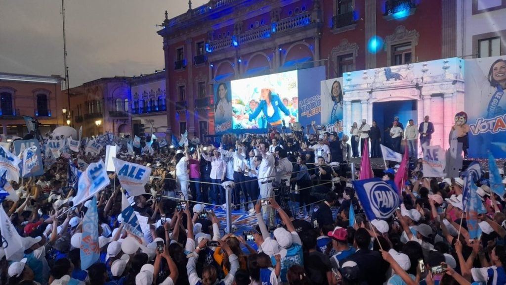 Con grandes pantallas LED, Alejandra Gutiérrez cerró su campaña este miércoles en la Plaza Principal, junto con sus dirigentes de partido y candidatos de Acción Nacional a los diferentes puestos públicos.