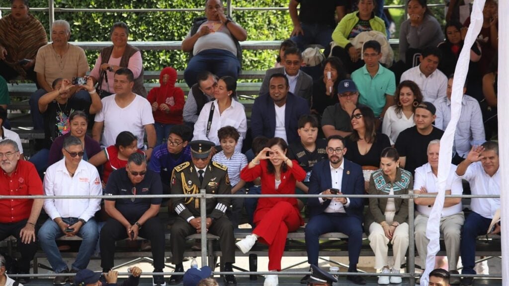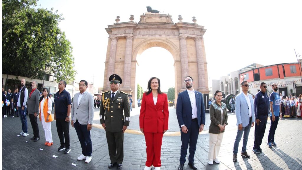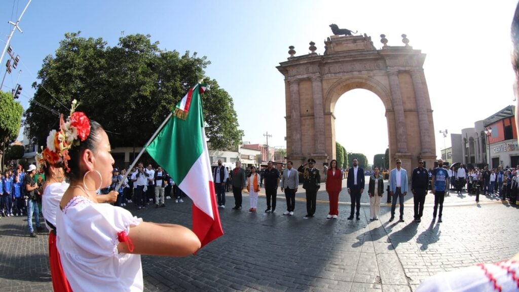 Antes de que iniciara el desfile, la presidenta municipal, Alejandra Gutiérrez Campos, acompañada por autoridades municipales y estatales, encabezó una solemne ceremonia de Honores a la Bandera en el Arco de la Calzada.