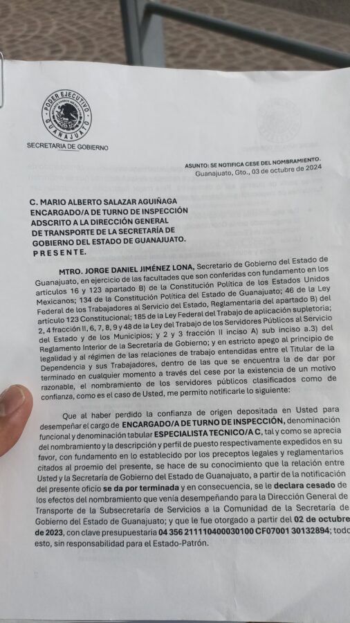 El señor Mario Alberto Salazar Zúñiga exige se le reintegré en su trabajo en la Dirección General de Transporte, dependiente de la Secretaría de Gobierno; por lo que rechaza la propuesta de liquidación que se le planteó.