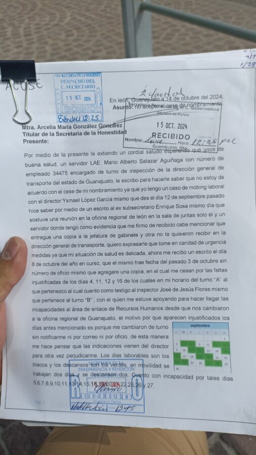 Mario Salazar presentó una denuncia ante la Secretaría de la Honestidad, antes Secretaría de Transparencia y Rendición de Cuentas, el pasado 15 de octubre a las 12:25 p m, de acuerdo al sello de recepción en la dependencia.