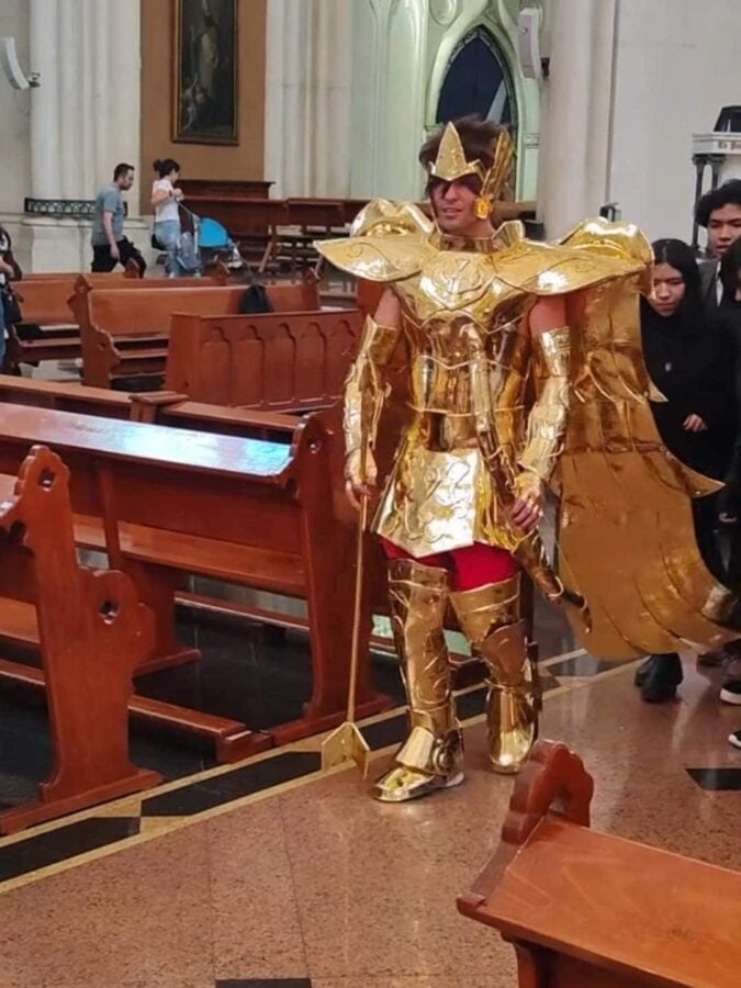 La pareja se casó el sábado en el templo con una vestimenta inspirada en la serie de anime “Saint Seiya”, mejor conocida como “Los Caballeros del Zodiaco”, que la marcó durante su infancia.