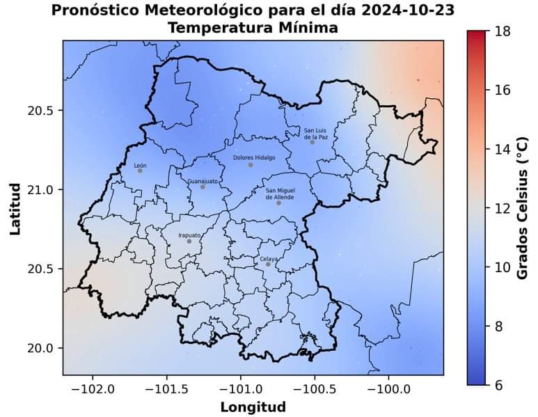"Es probable que el termómetro en varias zonas del estado de Guanajuato descienda hasta cerca de los 8 a 10°C, como se puede apreciar en el mapa de temperatura mínima. Por supuesto que en la zona serrana podría ser un par de grados menos que ese rango. Esta condición meteorológica se deberá por la presencia de un sistema de alta presión, también llamado anticiclón", puntualizó.