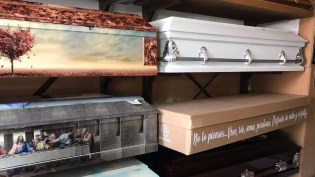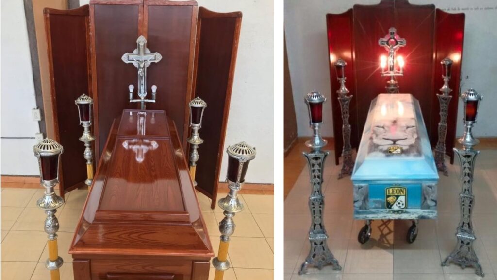 Los ataúdes vienen en diversos colores y con impresiones personalizadas, desde la Última Cena hasta los colores del equipo León, ¡e incluso de grupos musicales!