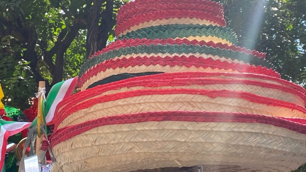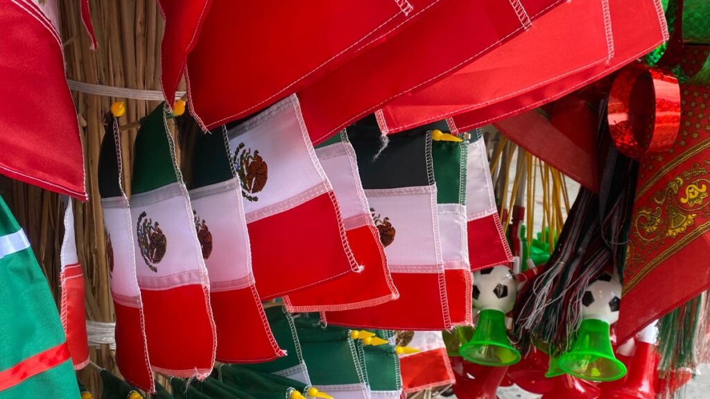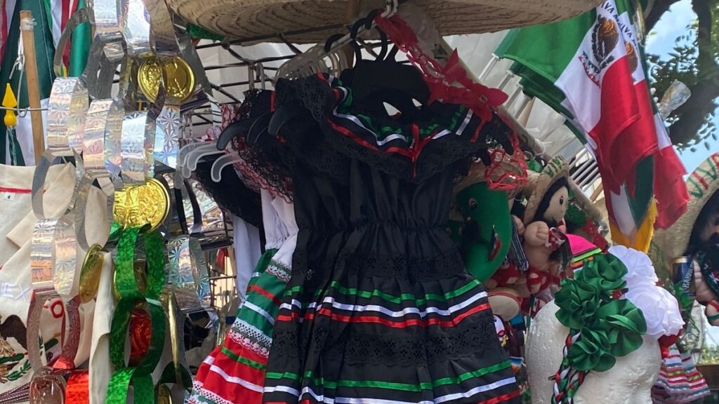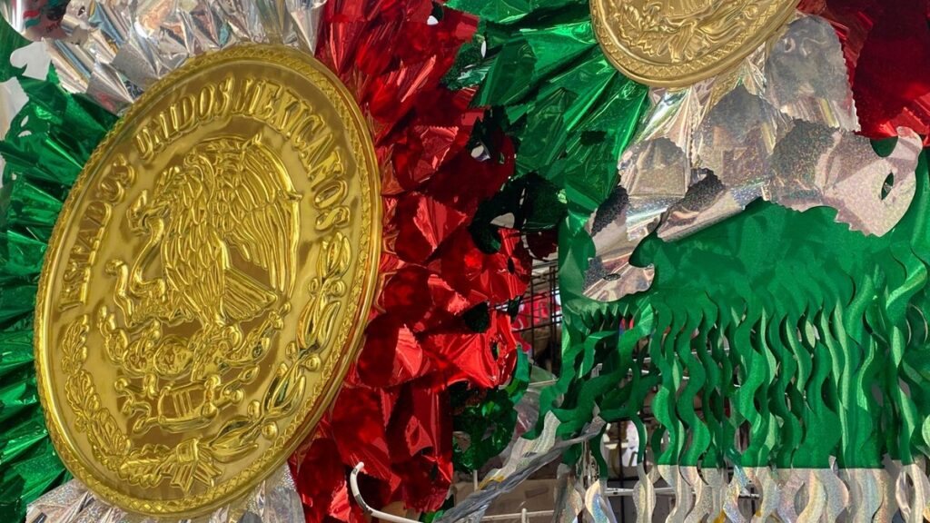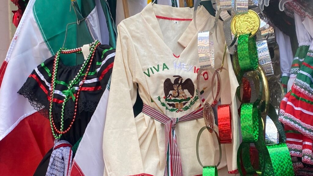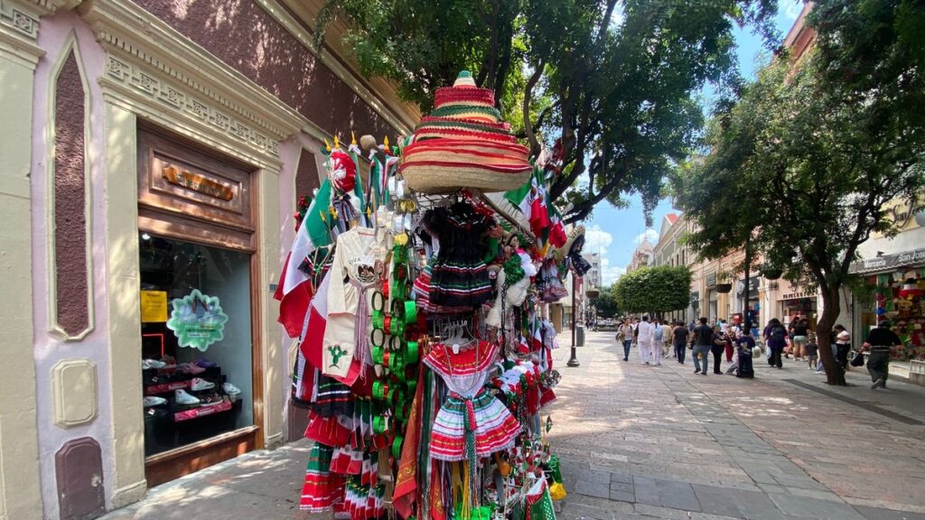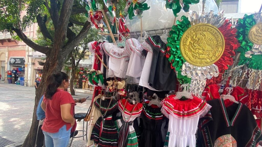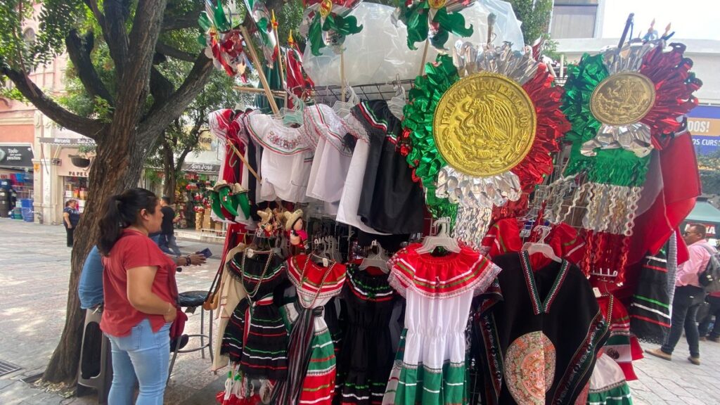 León, Guanajuato – Un carrito adornado con accesorios tricolores se instala en la zona peatonal del centro, en la calle 5 de Mayo, captando la atención de los transeúntes con banderas, sombreros, matracas y todo tipo de adornos patrios para niños.