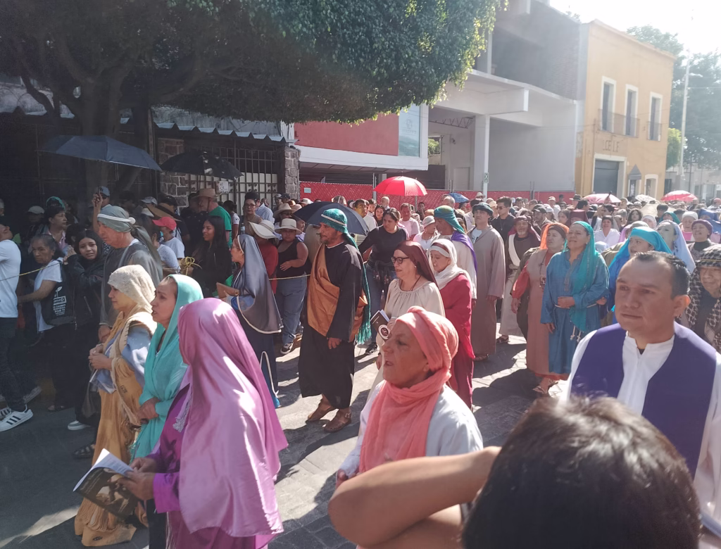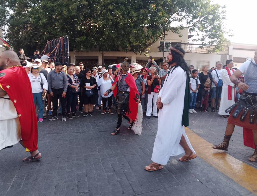 El viacrucis se realizó a lo largo de la calle Francisco I. Madero, donde se establecieron las diferentes estaciones, y concluyó en la Plaza Principal.