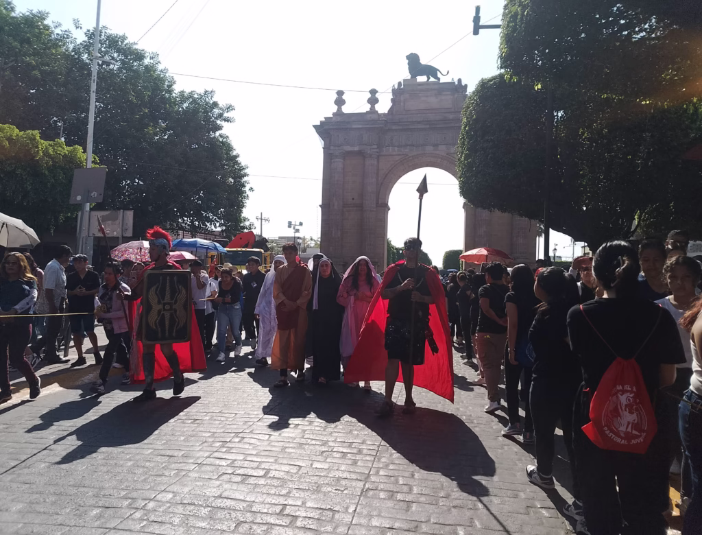León, Guanajuato - Este viernes por la mañana se realizó el viacrucis de la zona Centro de León con mensajes a fomentar la paz en la sociedad y a terminar con los diferentes tipos de violencia, dar la mano a los necesitados y no a la discriminación.