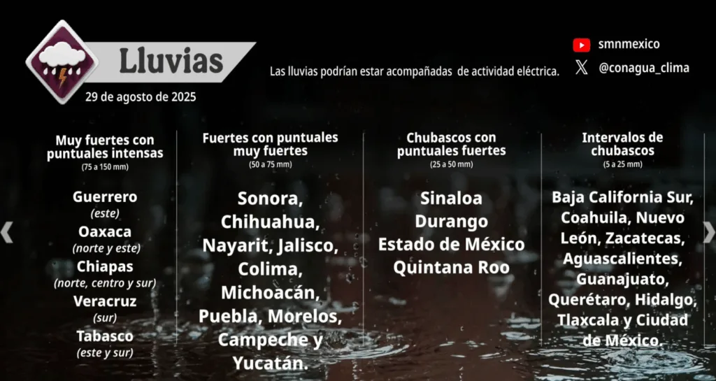 El Servicio Meteorológico Nacional (SMN) informó que un canal de baja presión, que se extenderá desde el norte hasta el centro del país, en combinación con el aire húmedo del Golfo de México, será el responsable de generar chubascos de intensidad variable (de 5 a 25 mm) con descargas eléctricas y posible granizo, sobre todo en algunas regiones de la entidad a partir de la tarde.