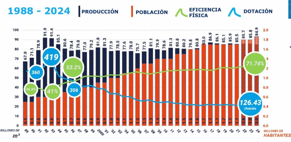 El presidente del SAPAL detalló que, en 1993, el consumo era de 419 litros diarios por persona. Para 1997, se redujo a 306 litros diarios por persona.