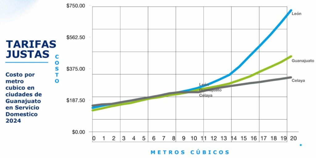 Más del 85% de las cuentas de uso doméstico en el municipio están subsidiadas en el costo por metro cúbico. Son tarifas justas; hasta los 11 metros cúbicos tenemos tarifas similares a las de Celaya y Guanajuato. A partir del 12, 13 y 15 metros cúbicos, efectivamente, el agua en León sube”.