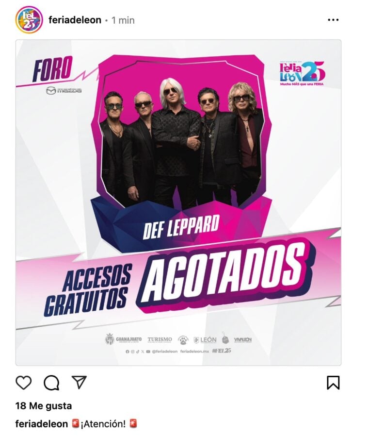 León, Guanajuato - En un abrir y cerrar de ojos, los boletos para ver a Def Leppard en el Foro Mazda el próximo 18 de enero se agotaron, pues fue más la espera en la fila digital que la disponibilidad que tuvieron en el sistema de entrega de la Feria de León 2025.