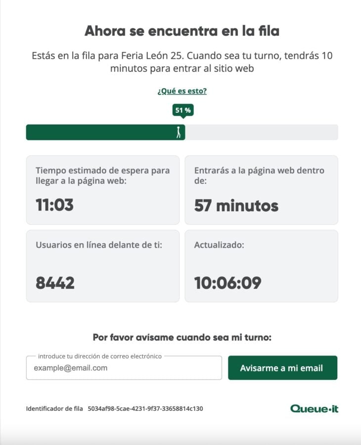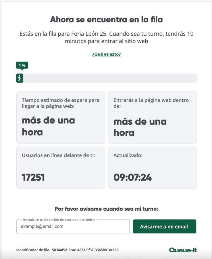 Exactamente a las 10:06 de la mañana, la fila virtual marcaba más de 8 mil personas intentando ingresar, pero justo en ese mismo momento el estatus del evento se marcó como agotado.