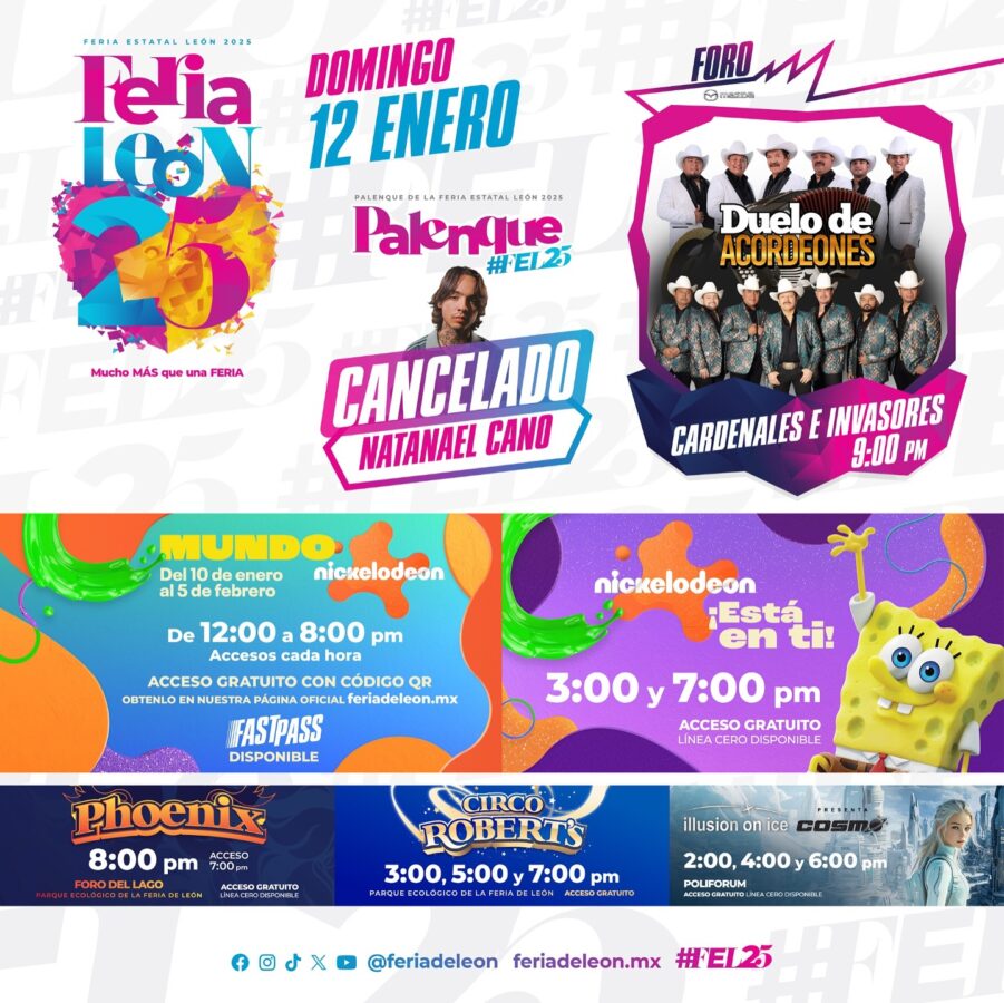 Sin un comunicado o mayores explicaciones, la Feria de León simplemente publicó su agenda para este domingo, y en la sección del Palenque se puede ver que aparece un mensaje que dice: "Cancelado Natanael Cano", junto a una imagen del intérprete de corridos tumbados.