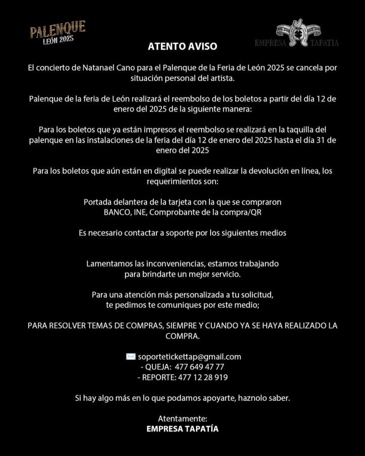 Ahí también se explicó que el proceso de reembolso se dará a través de la boletera, siendo en este caso Empresa Tapatía la encargada devolver el dinero a quienes ya habían comprado su boletos para ver a Natanael en la Feria de León.