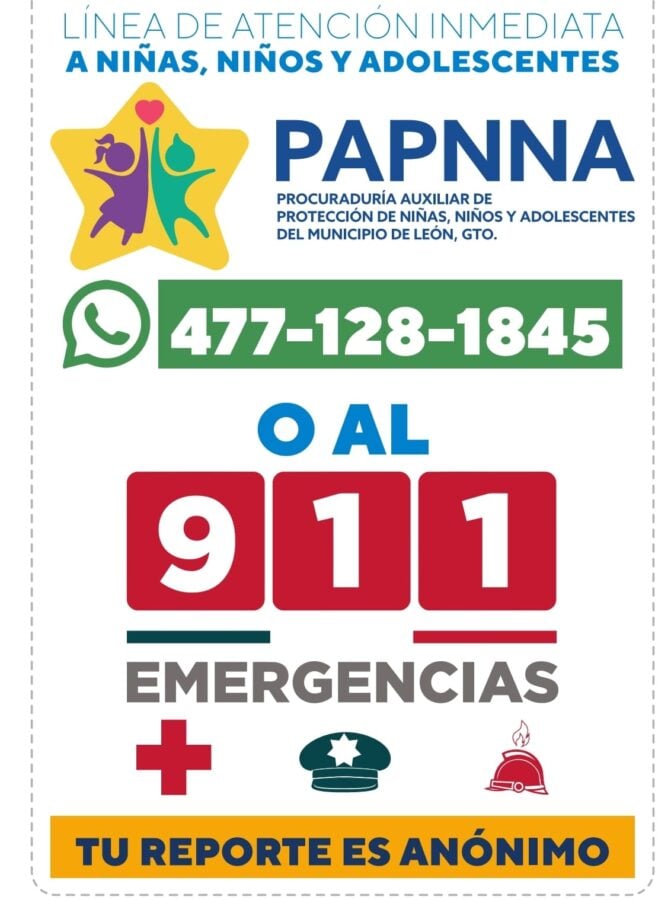 Precisó que los reportes por maltrato, violencia o agresiones en contra de menores se pueden realizar al 911, pero también al número 477-128-1845.