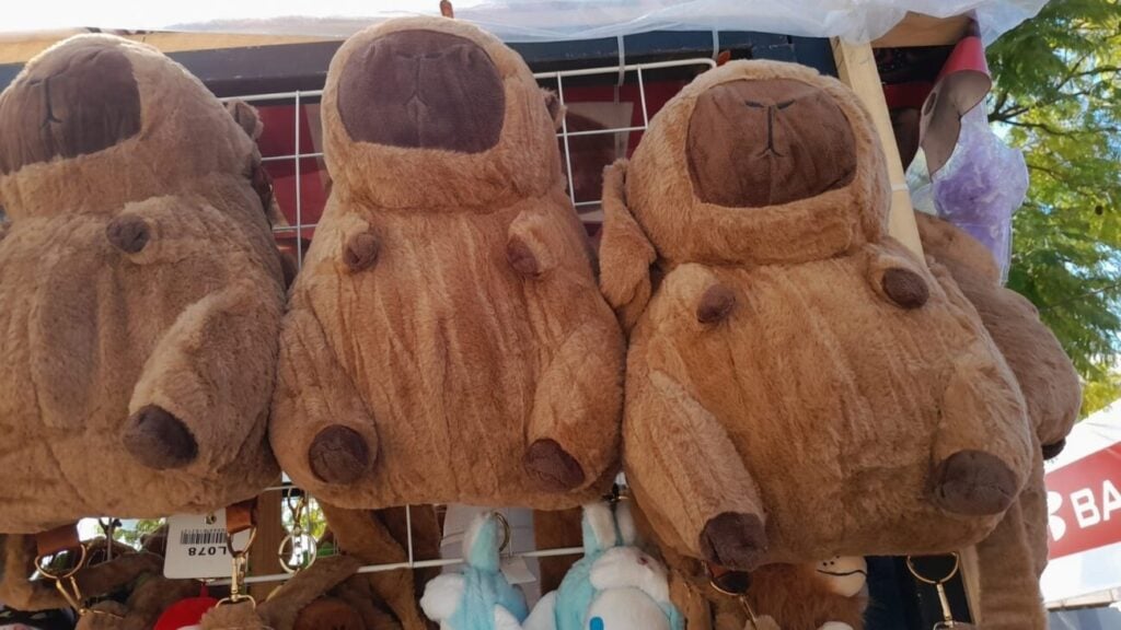 León, Guanajuato - El año pasado fueron patos, pero ahora diversos accesorios de capibaras se popularizaron en la Feria Estatal de León, entre los que destacan pinzas para el cabello, llaveros, peluches, bolsas, pijamas, pantuflas y más.