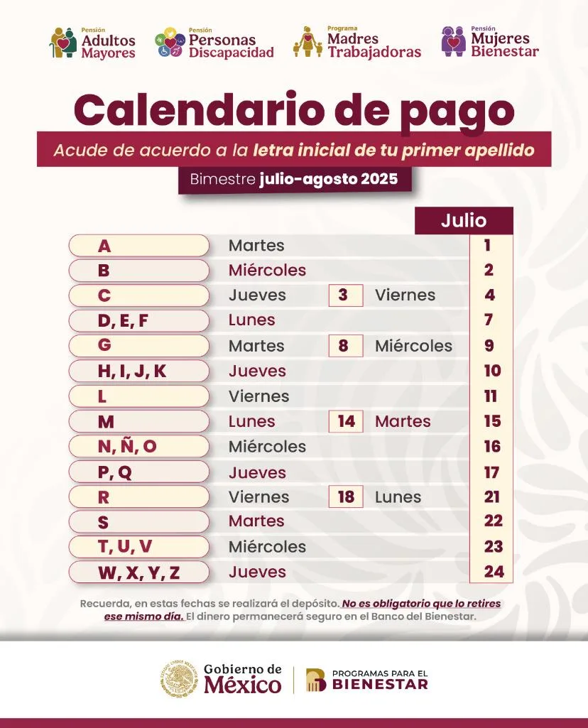 El depósito o dispersión comenzó a darse desde el 1 de julio y hasta el 24 de julio; recurso que se puede retirar de acuerdo con las primeras letras del apellido conforme lo establece el calendario oficial.