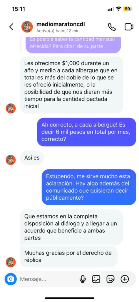 “Se nos prometió el donativo de $30 por corredor inscrito. De acuerdo con la cifra oficial del evento, participaron 1,489 personas, lo que representa un apoyo total pendiente de $44,670 pesos, a dividir entre los seis albergues. A la fecha, no hemos recibido ningún recurso”.