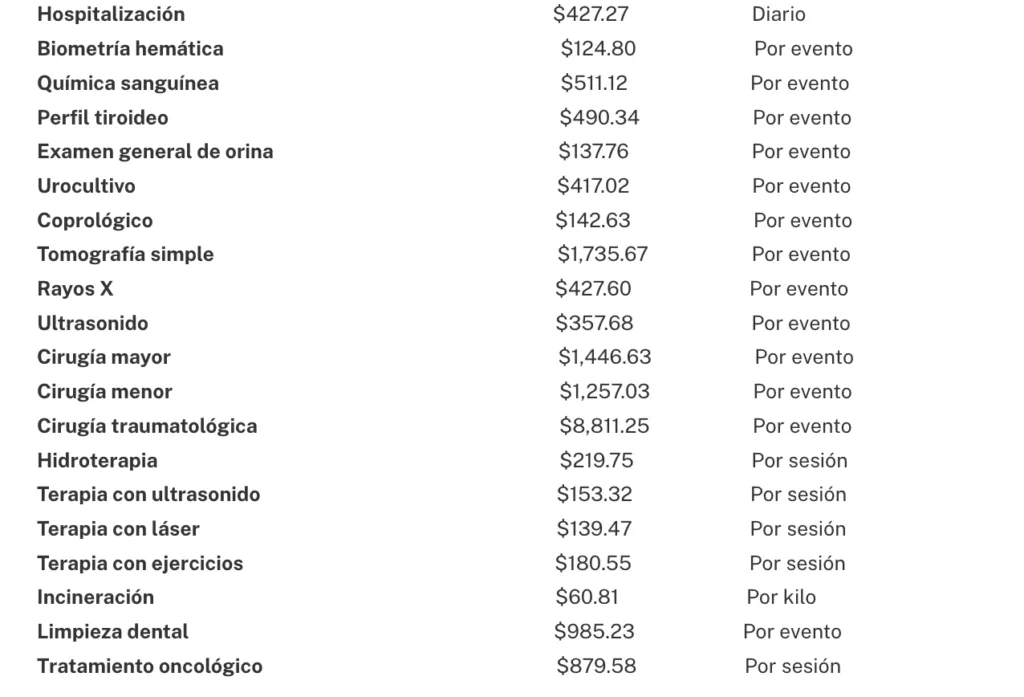 Los costos irán desde los 25 pesos por la aplicación de una inyección intramuscular, hasta los 8 mil 800 pesos para una cirugía mayor.