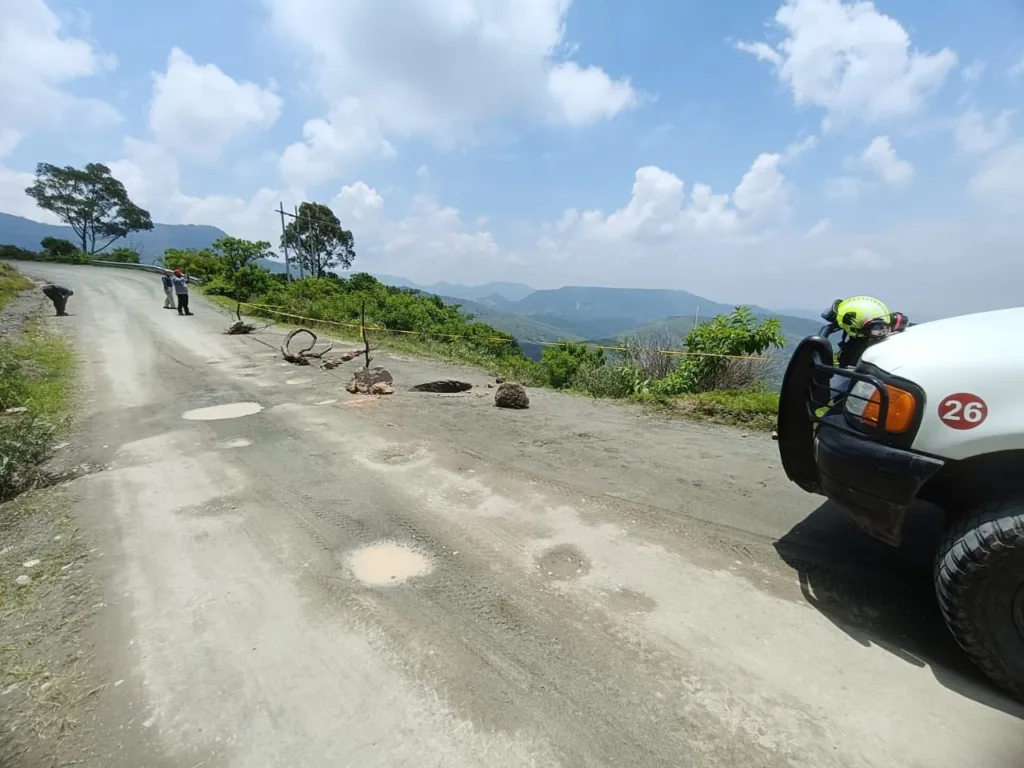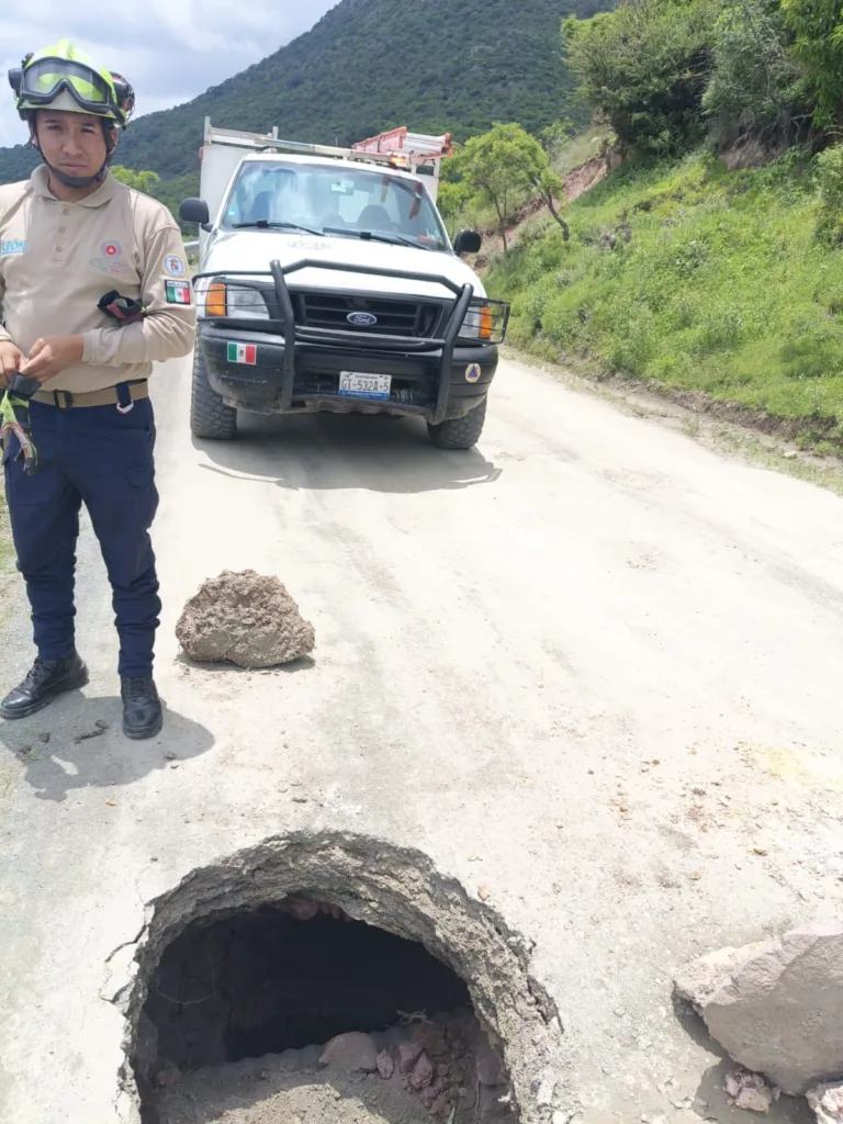 El profundo socavón se generó sobre una orilla de la carretera a unos centímetros de un barranco, lo que podría poner en riesgo la vida de los conductores.