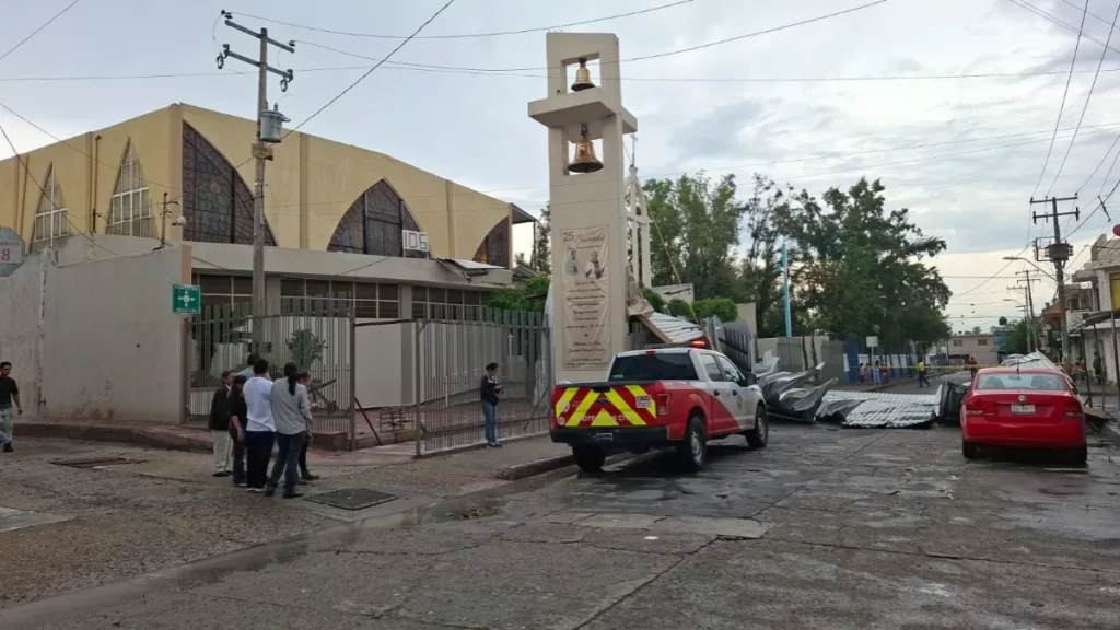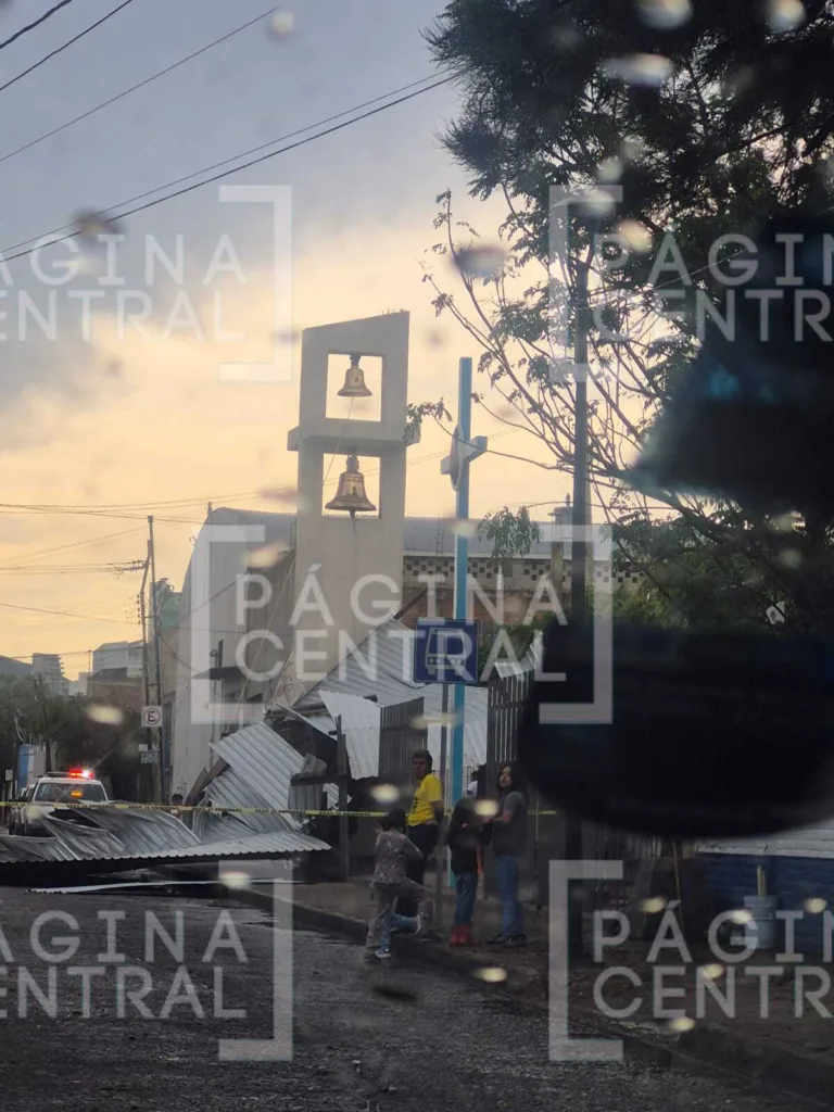 León, Guanajuato – Como resultado de la tormenta registrada la tarde de este miércoles, el fuerte viento provocó que una techumbre de lámina de la Parroquia de Nuestra Señora de Guadalupe de la colonia Casa Blanca cayera.