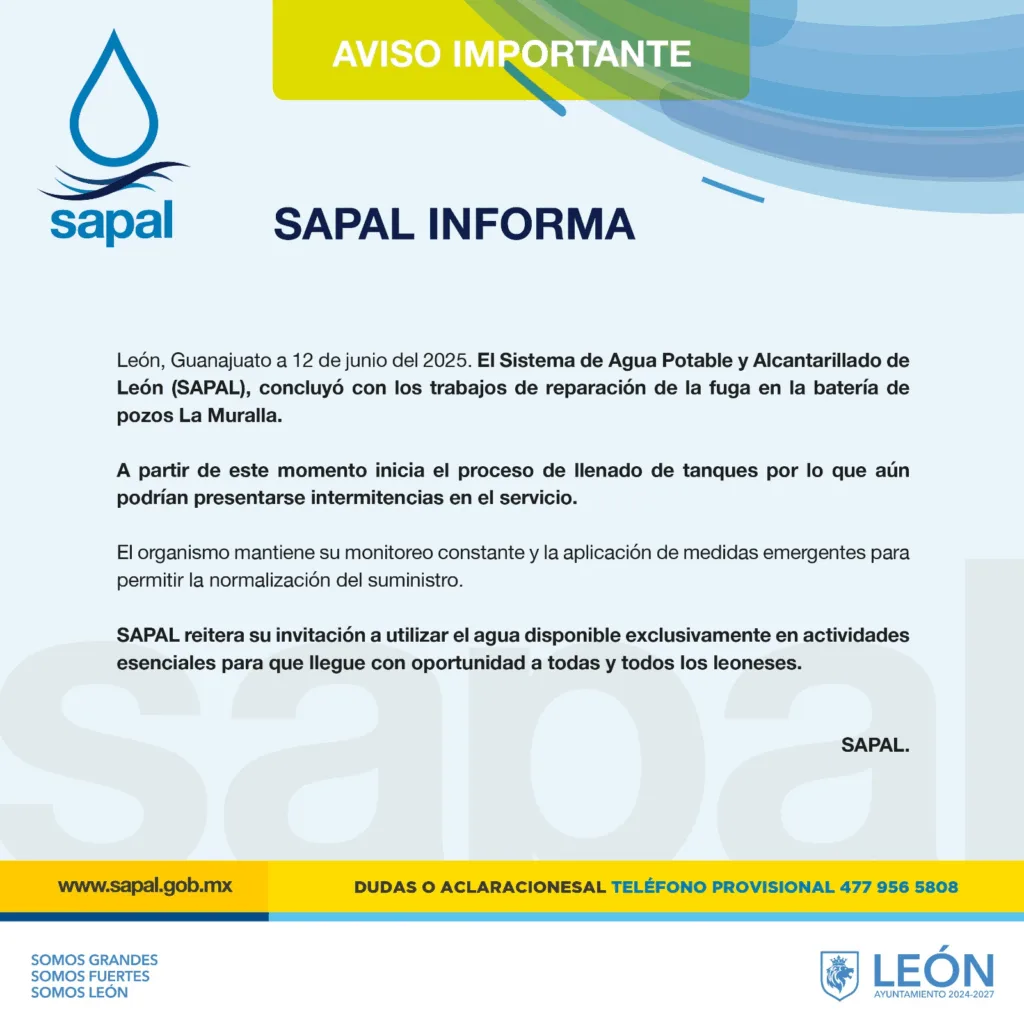 León, Guanajuato - El Sistema de Agua Potable y Alcantarillado de León (Sapal) informó a través de un comunicado oficial que ha concluido con éxito los trabajos de reparación de la fuga registrada en la batería de pozos La Muralla, ubicada en la zona sur-oriente del municipio.