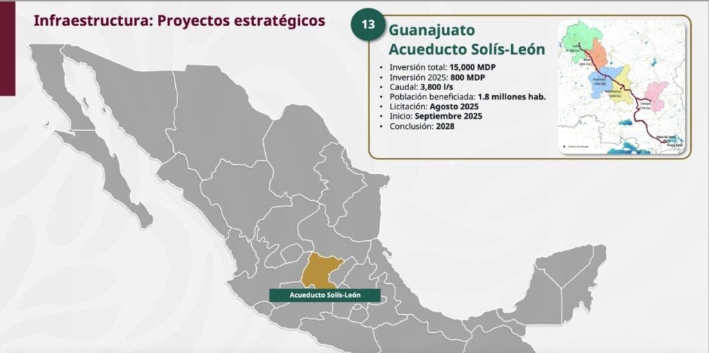 En la conferencia mañanera, el director general de la Comisión Nacional del Agua (Conagua), Efraín Morales López, informó que continúan desarrollando los proyectos ejecutivos del acueducto que recorrerá desde la Presa Solís, ubicada en Acámbaro, y pasará por Celaya, Salamanca, Irapuato, Silao y León.