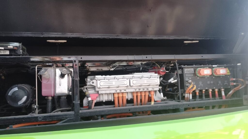 Los autobuses eléctricos cuentan con al menos 10 baterías, todo el sistema es eléctrico y cuentan con enchufes de carga.