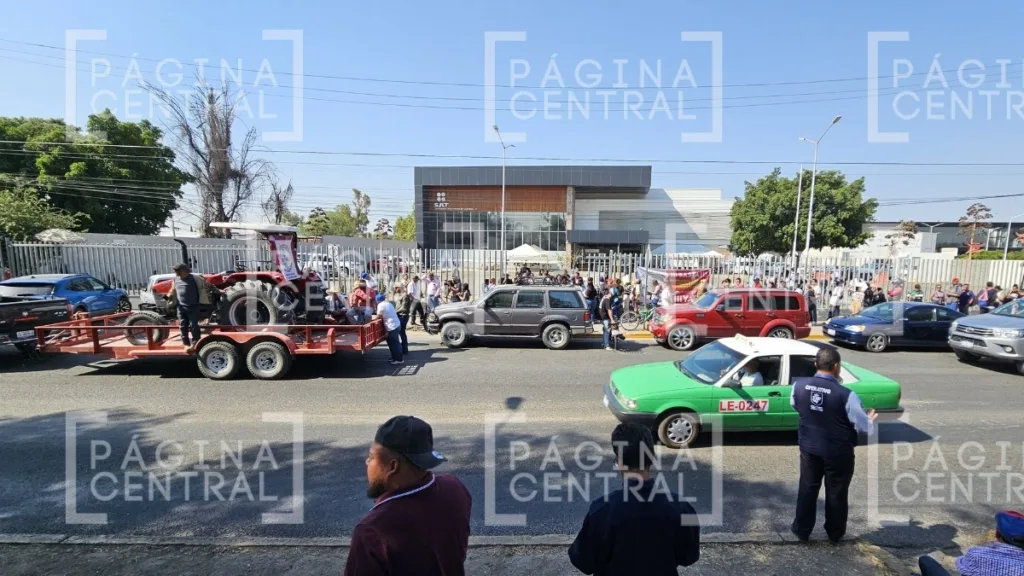 León, Guanajuato - Integrantes del Comité Pro Mejoramiento del Agro Guanajuatense realizaron una manifestación afuera de las instalaciones del SAT para exigir la liberación de apoyos al agro que, a su decir, se les deben desde el año 2022.