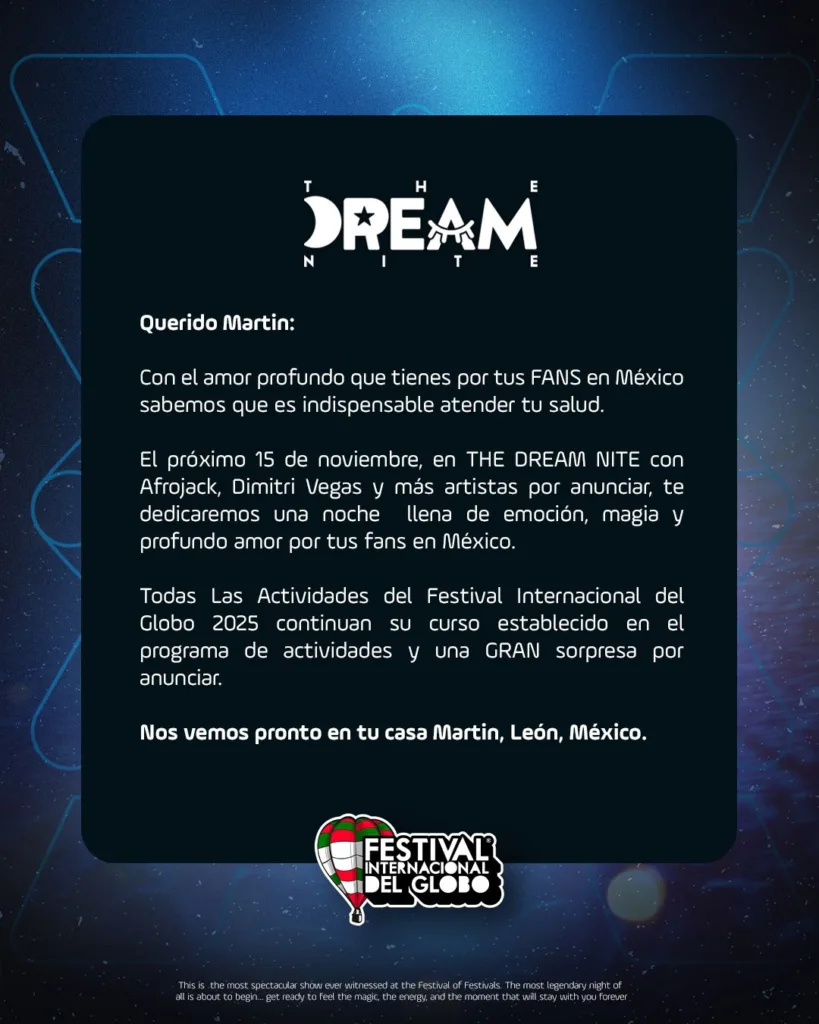 Por lo pronto, los organizadores, además de enviar toda su buena vibra y pronta recuperación, informaron que se mantendrá The Dream Nite con Afrojack y Dimitri Vegas, y una sorpresa.