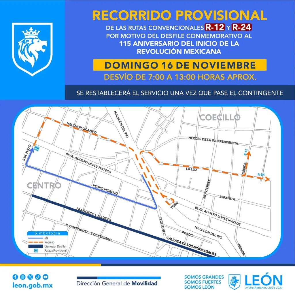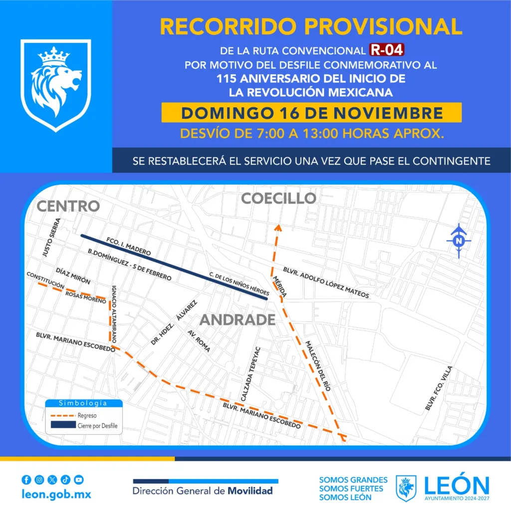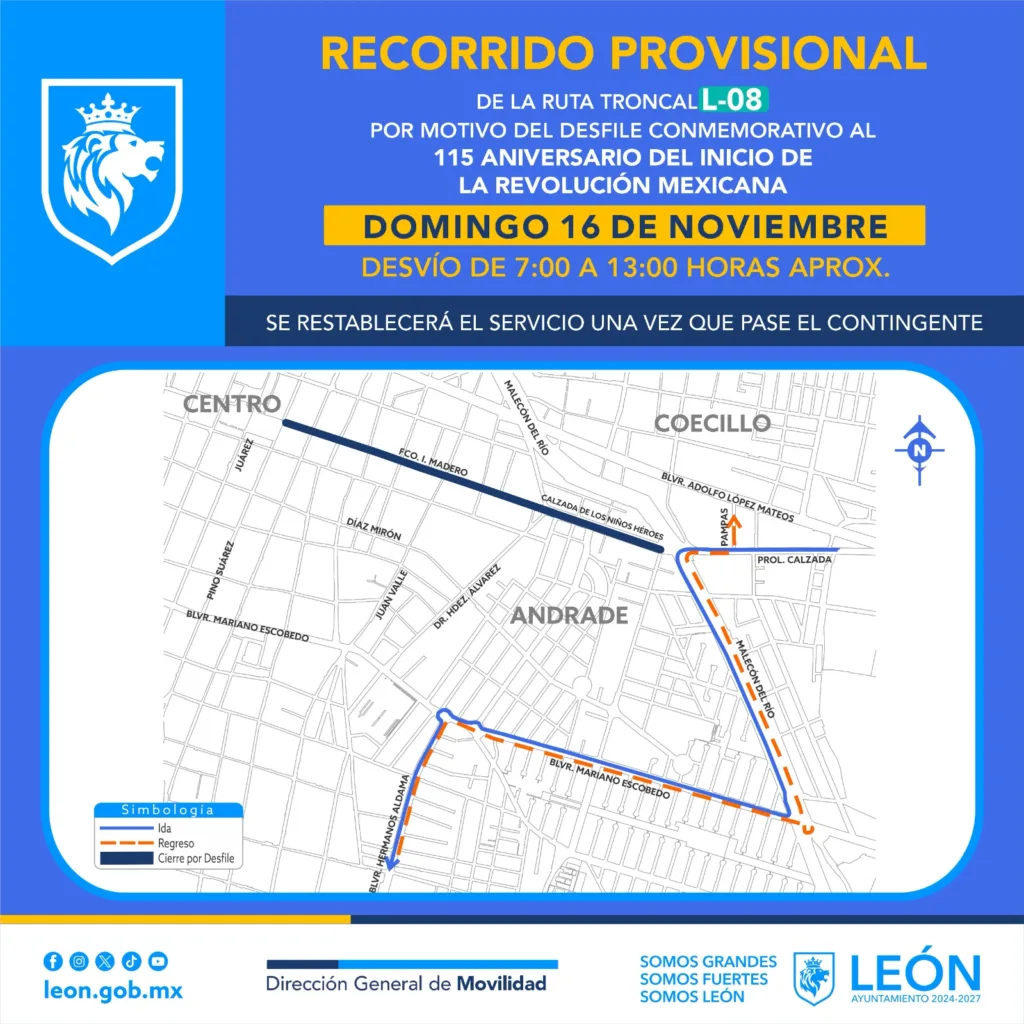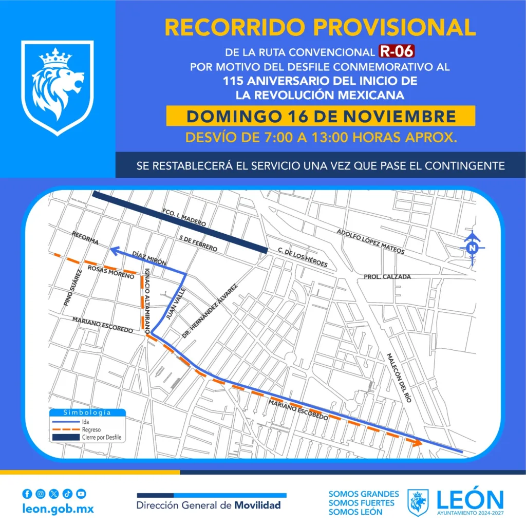 León, Guanajuato - Por motivo del Desfile Conmemorativo al 115 Aniversario de la Revolución Mexicana que se celebrará el domingo 16 de noviembre en punto de las 10 de la mañana, habrá desvíos temporales de rutas del transporte público.