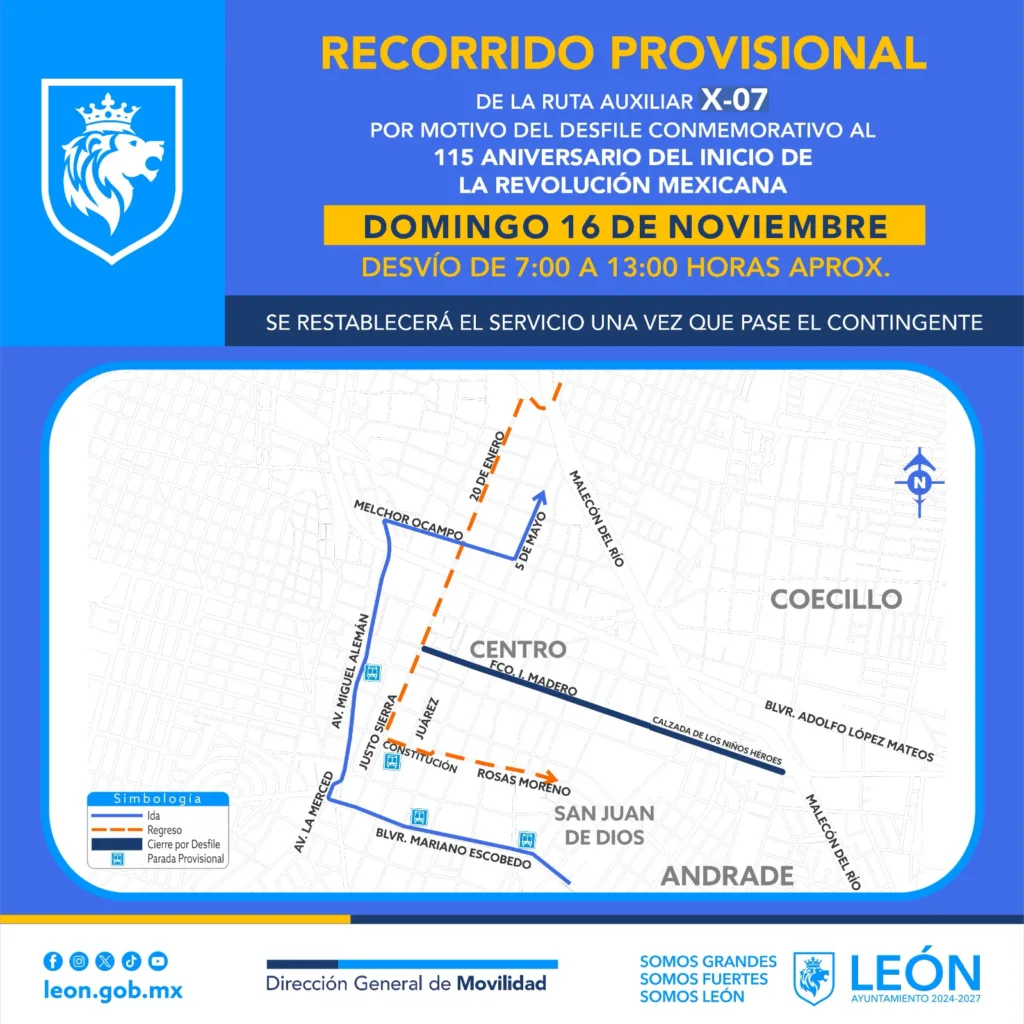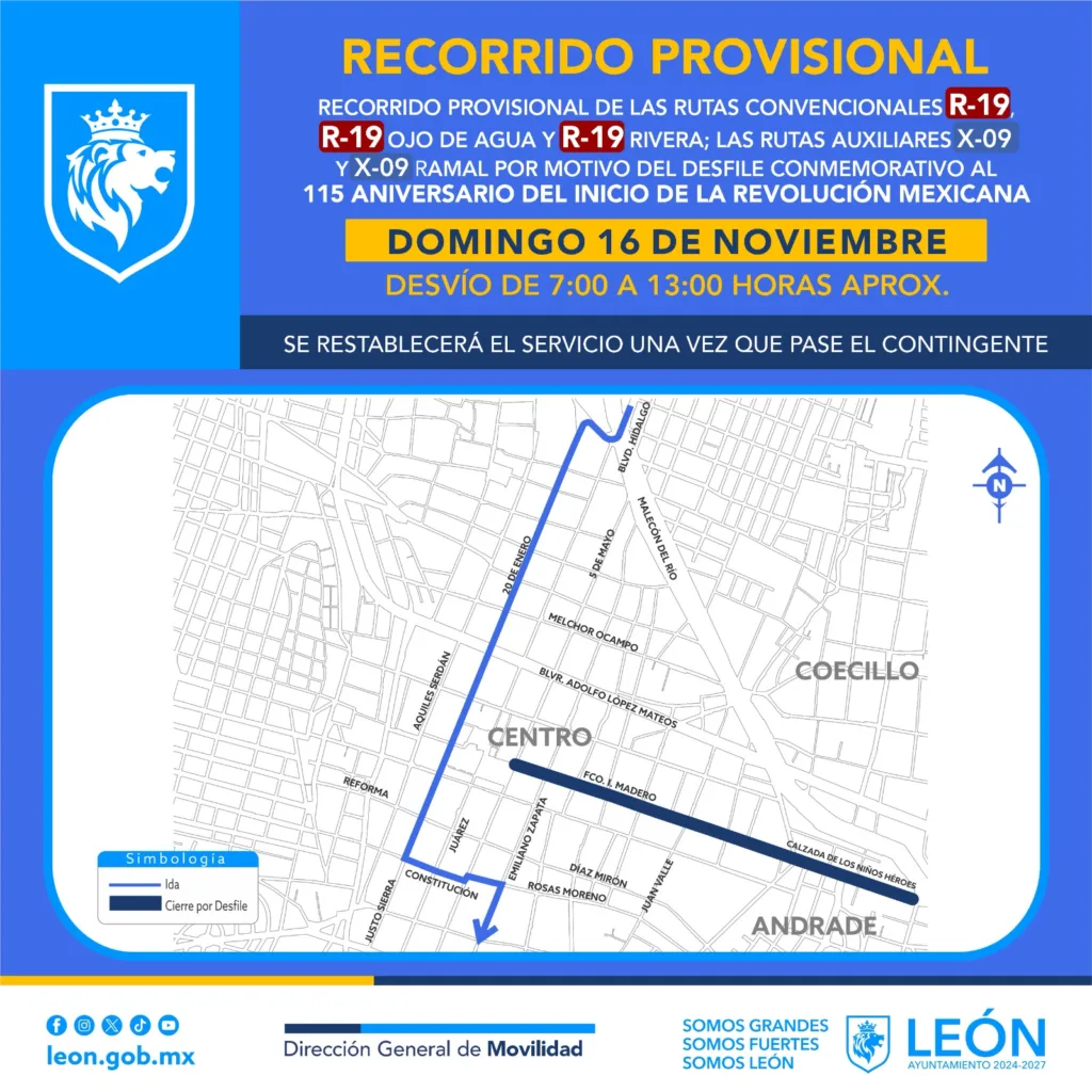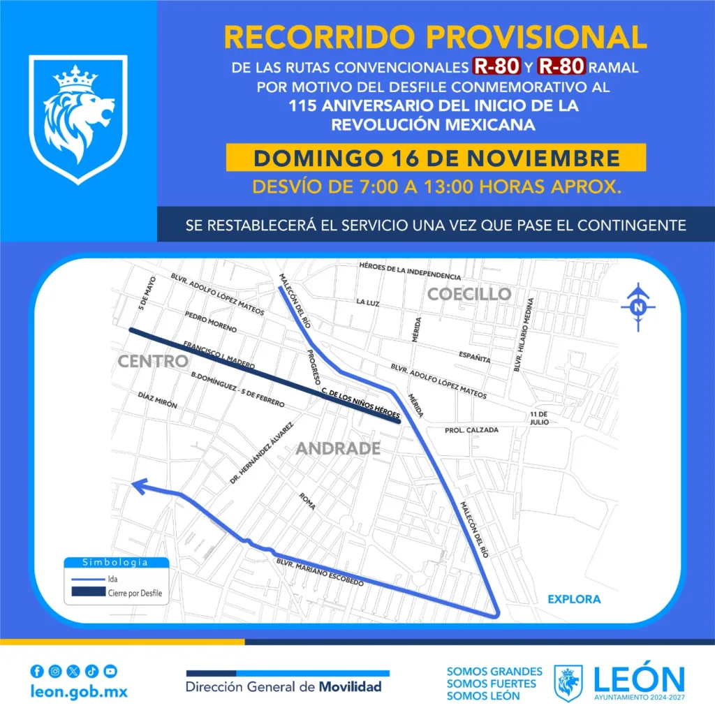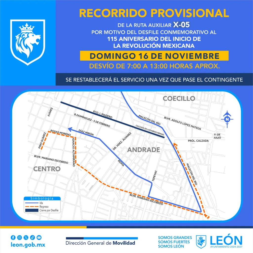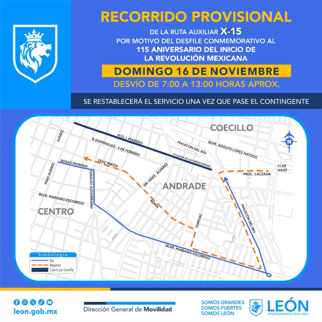 León, Guanajuato - Por motivo del Desfile Conmemorativo al 115 Aniversario de la Revolución Mexicana que se celebrará el domingo 16 de noviembre en punto de las 10 de la mañana, habrá desvíos temporales de rutas del transporte público.