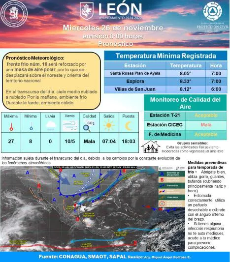 León— Este miércoles se anticipa un día de contrastes en León, con una tarde cálida y una noche de fría a fresca, de acuerdo con el pronóstico del Servicio Meteorológico Nacional (SMN) de la Conagua.