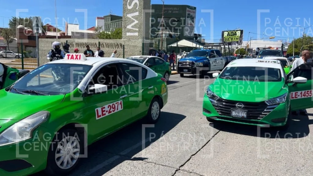 León, Guanajuato - Decenas de taxis verdes y de plataforma bloquearon la mañana de este martes el bulevar Insurgentes ante su inconformidad con policías viales, quienes querían desalojarlos de una zona de ascenso y descenso frente al hospital del IMSS.