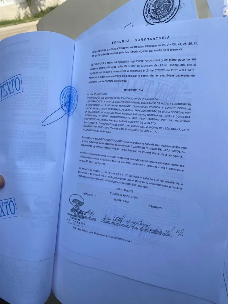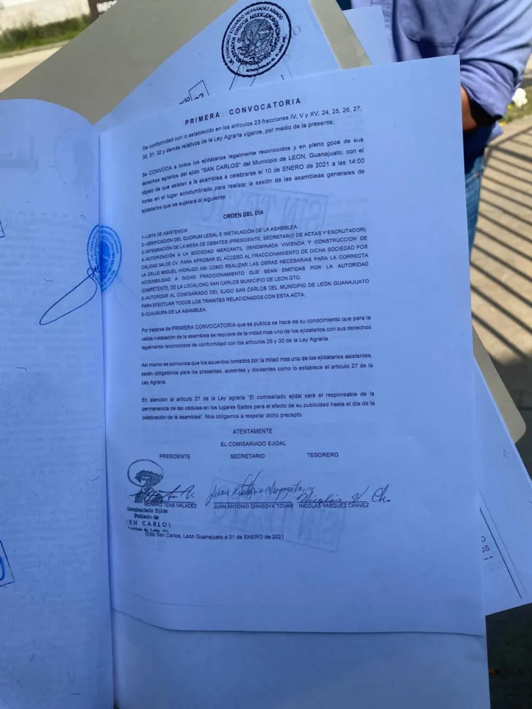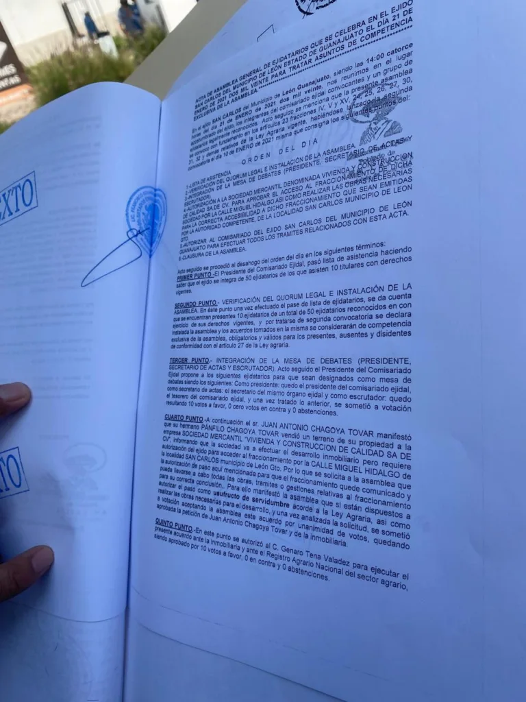El acta de la asamblea protocolizada ante notario público con sello, indica que se autorizó al entonces presidente comisario ejidal, Genaro Tena Valadez, ejecutar el acuerdo con la inmobiliaria “Vivienda y Construcción de Calidad S A de C V”.