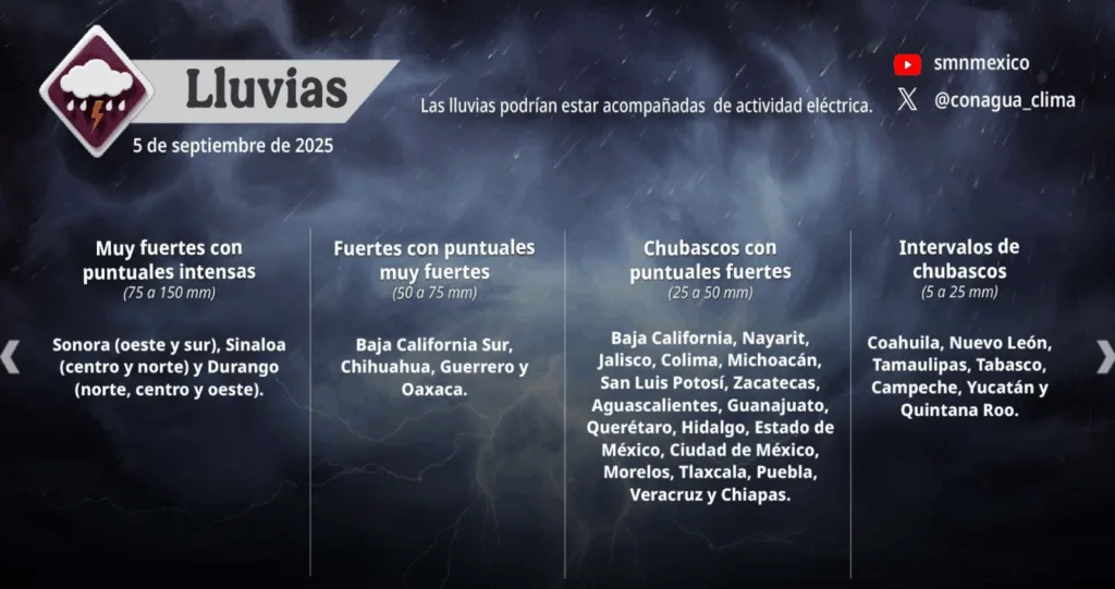 En el resto de Guanajuato, el SMN advierte que habrá un cielo nublado durante todo el día, con lluvias fuertes de 25 a 50 mm, acompañadas de tormentas eléctricas y posible granizo.