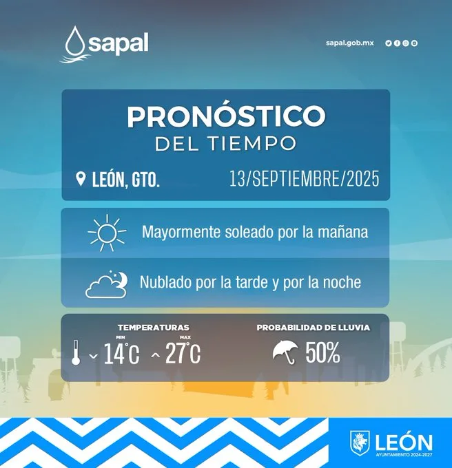 De acuerdo a los pronósticos del Sistema de Agua Potable y Alcantarillado de León (Sapal), hoy habrá una temperatura máxima de 27 grados centígrados y una mínima de 14.