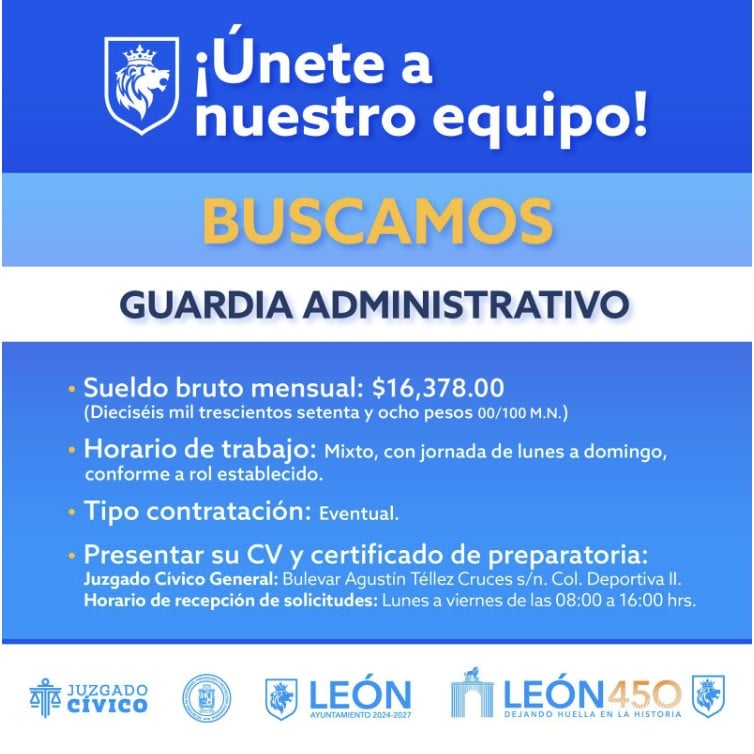 El perfil busca personas con disposición para realizar labores de vigilancia y apoyo administrativo dentro de las sedes de justicia cívica del municipio. Te puede interesar: Convocatoria guardaparques León 2026: ofrecen hasta 19 mil pesos; estos son los requisitos