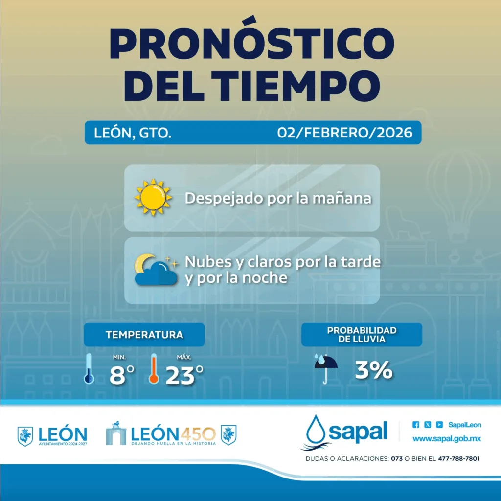 La buena noticia es que, de acuerdo con el Sistema de Agua Potable y Alcantarillado de León (Sapal), la probabilidad de lluvia es muy baja, apenas del 3 por ciento, por lo que no se esperan precipitaciones.