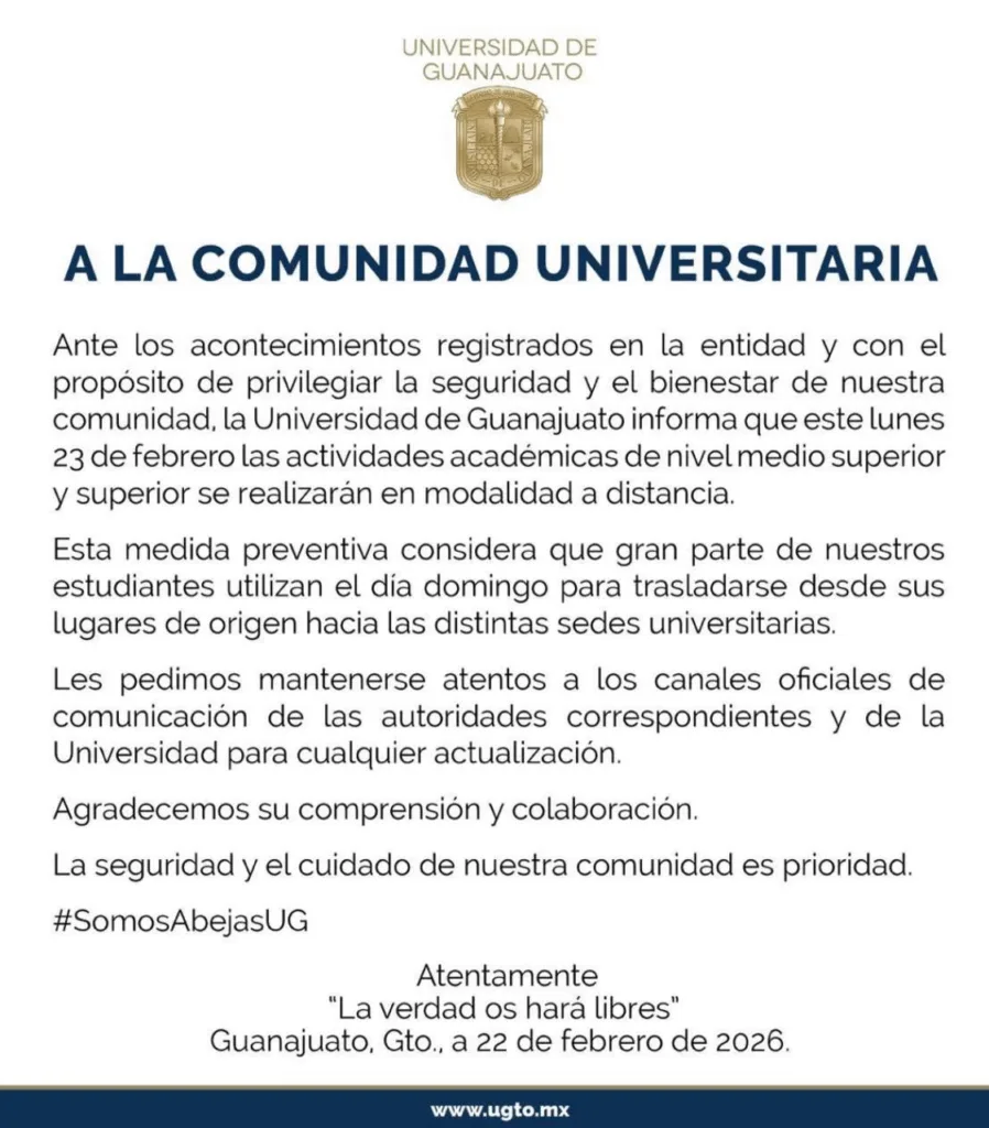 León, Guanajuato - La Universidad de Guanajuato informó la suspensión de clases para este lunes 23 de febrero, con el propósito de que los estudiantes no realicen traslados hacia las ciudades donde se ubican sus distintas sedes académicas.
