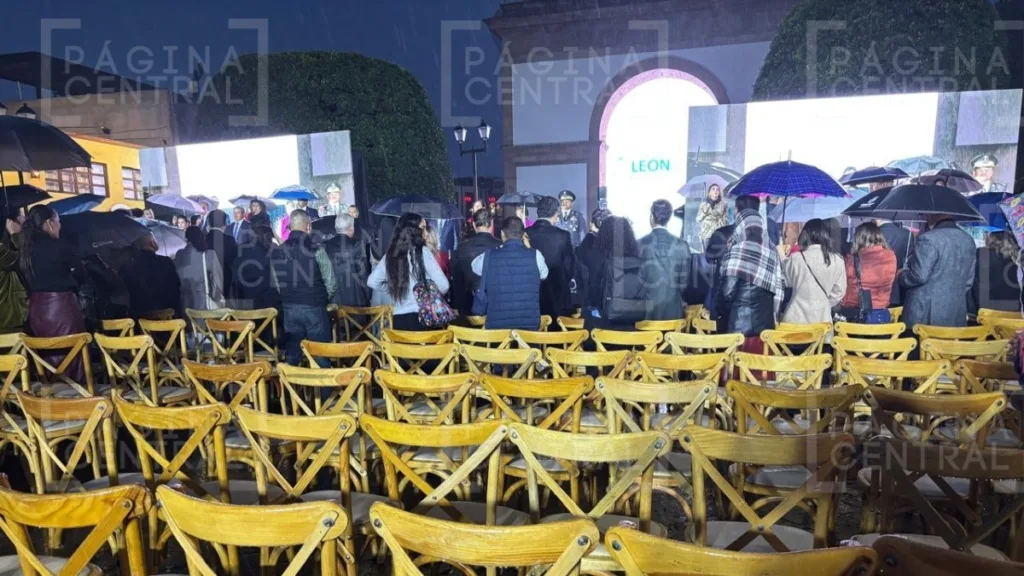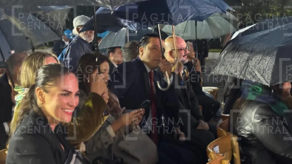 La alcaldesa Alejandra Gutiérrez, síndicos, regidores y los pocos invitados que decidieron permanecer, así como parte del gabinete, se mantuvieron en sus lugares, tolerando el frío y la lluvia. En el mejor de los casos, compartiendo paraguas; otros corrieron a resguardarse bajo los árboles.