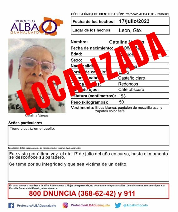Desde la FGE dijo que una vez recibida la denuncia por la desaparición de la madre buscadora Catalina Vargas se activaron los protocolos de búsqueda, entre ellos el Protocolo Alba, lo que permitió a la Unidad Especializada en Investigación de Personas Desaparecidas localizar a la buscadora en un anexo de León.