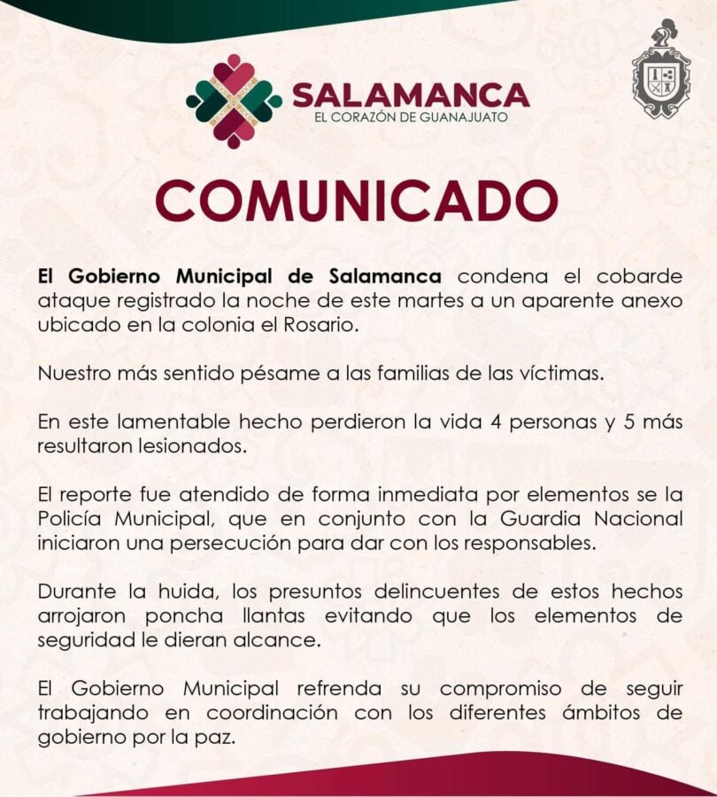 Vecinos que escucharon los disparos alertaron a las autoridades, y al arribar al lugar, elementos de la Policía Municipal de Salamanca, Guardia Nacional, Ejército Mexicano y Fuerza Estatal de Seguridad Pública (FSPE) se encontraron con una escena dantesca.
