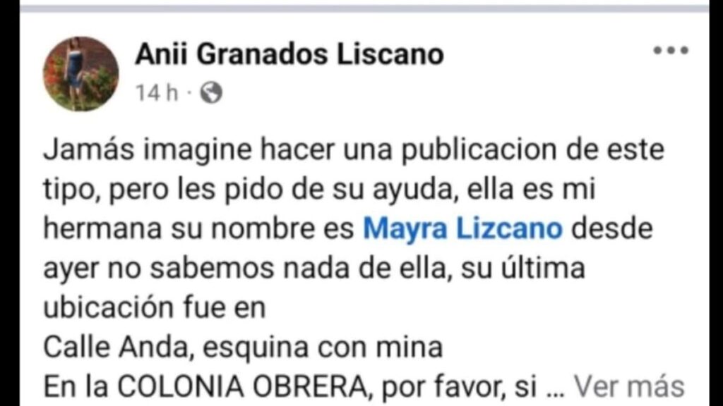 Jamás imaginé hacer una publicación de este tipo, pero les pido su ayuda, ella es mi hermana, su nombre es Mayra Liscano y desde ayer no sabemos nada de ella, su última ubicación fue en calle Anda, esquina con Mina en la colonia Obrera".