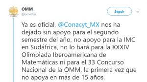 A través de su cuenta oficial en Twitter, la Olimpiada Mexicana de Matemáticas (OMM), anunció que el Consejo Nacional de Ciencia y Tecnología (Conacyt) retiró el apoyo para los eventos de esta materia que se realizarán durante la segunda mitad del año y es la primera vez que esto ocurre en más de 15 años.