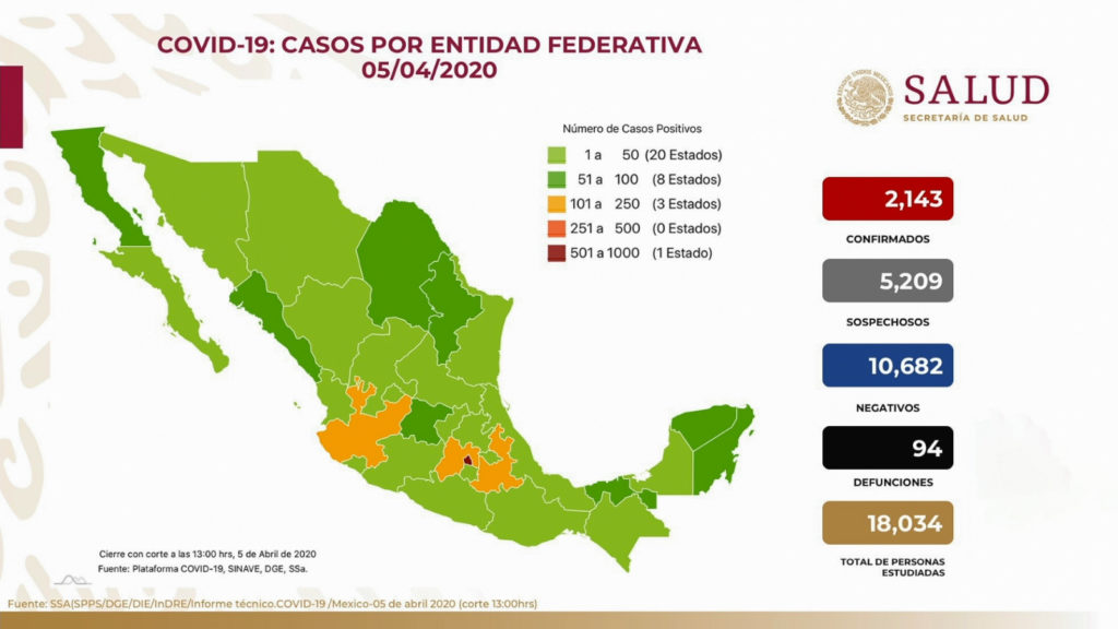 En conferencia de prensa, este domingo 5 de abril, la Secretaría de Salud federal informó que hasta ahora se cuenta con 2 mil 143 casos confirmados en el país.