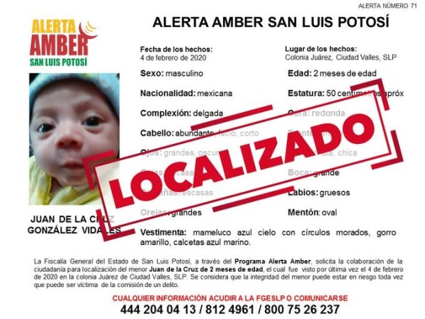 El bebé Juan de la Cruz González Vidales, de 2 meses de edad, fue localizado con vida, informó la Fiscalía de San Luis Potosí.